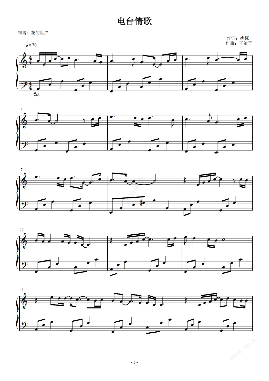 钢琴谱:电台情歌 C调简易版  莫文蔚