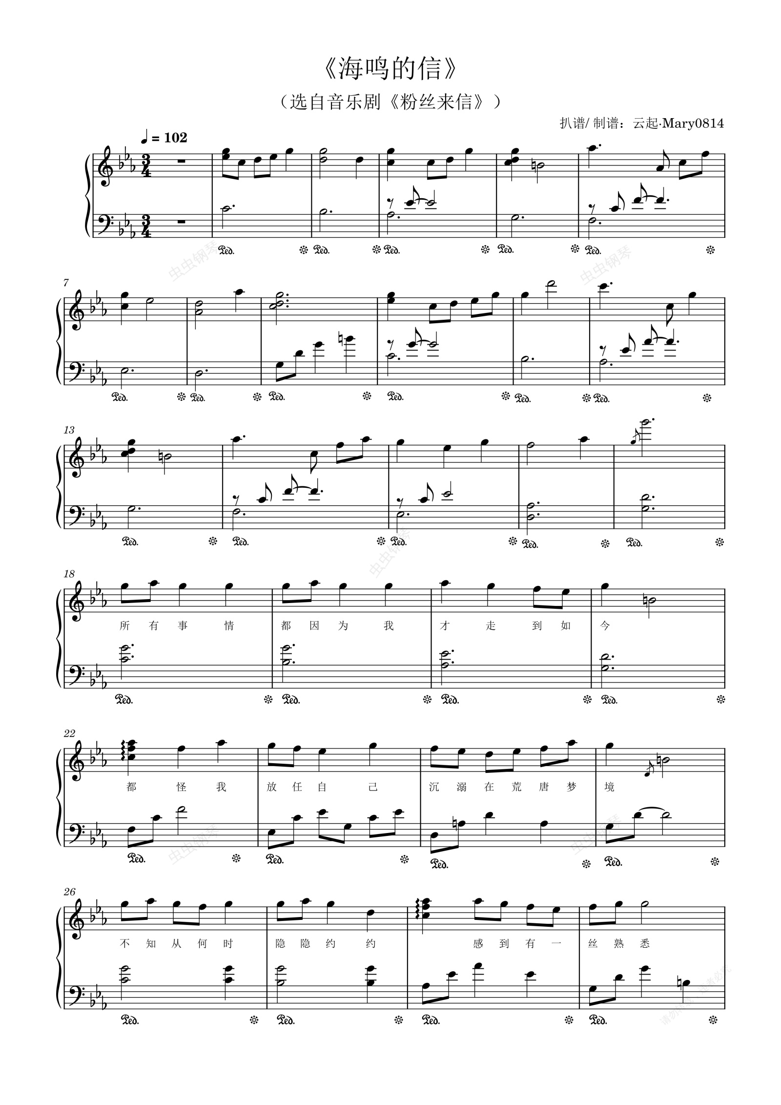 钢琴谱:《海鸣的信》自扒钢琴谱选自音乐剧《粉丝来信》(原调附歌词)