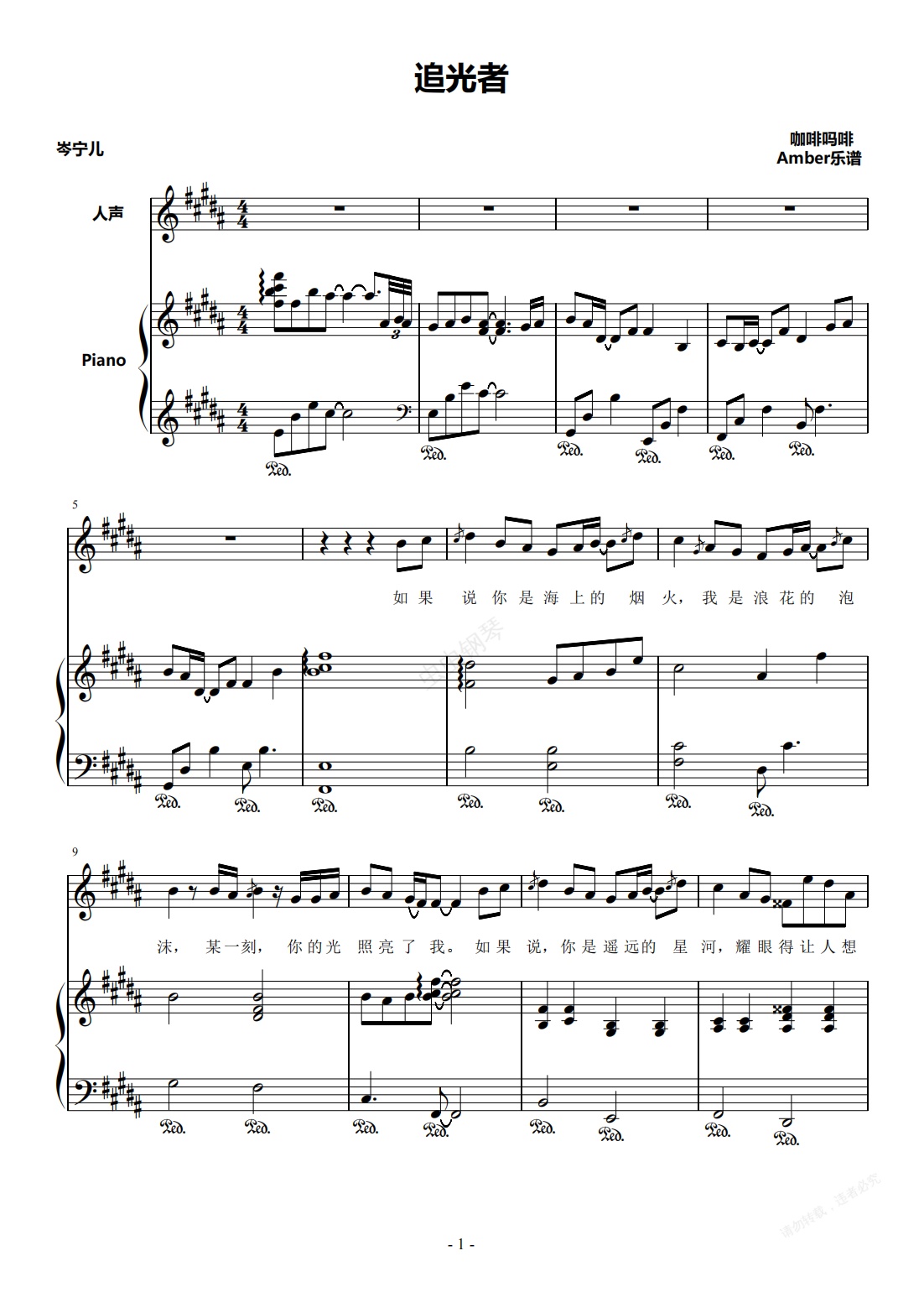 钢琴谱:追光者-岑宁儿 钢琴伴奏谱
