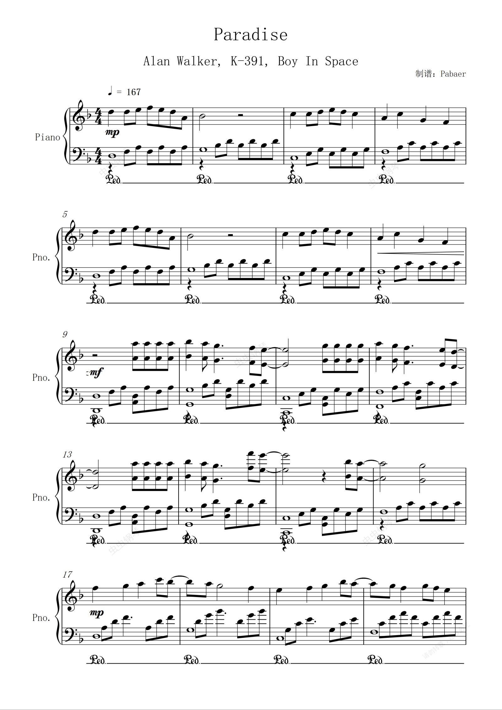 钢琴谱:Paradise – Alan Walker, K-391, Boy In Space