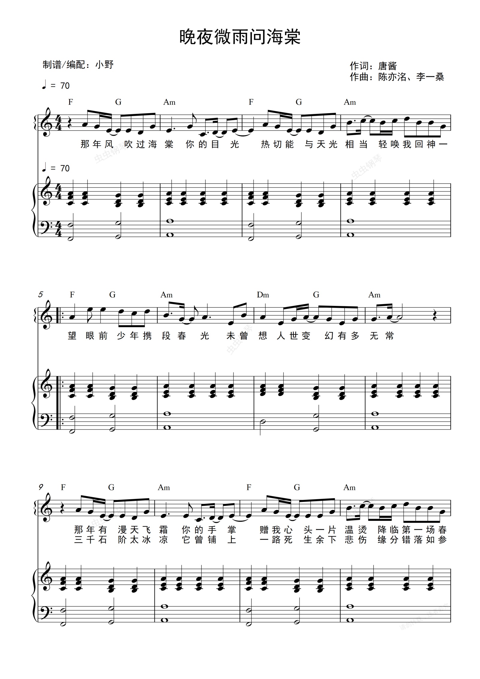 钢琴谱:晚夜微雨问海棠(和弦弹唱版)