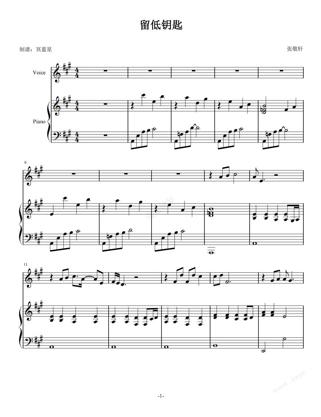 钢琴谱:留低钥匙-张敬轩-伴奏谱