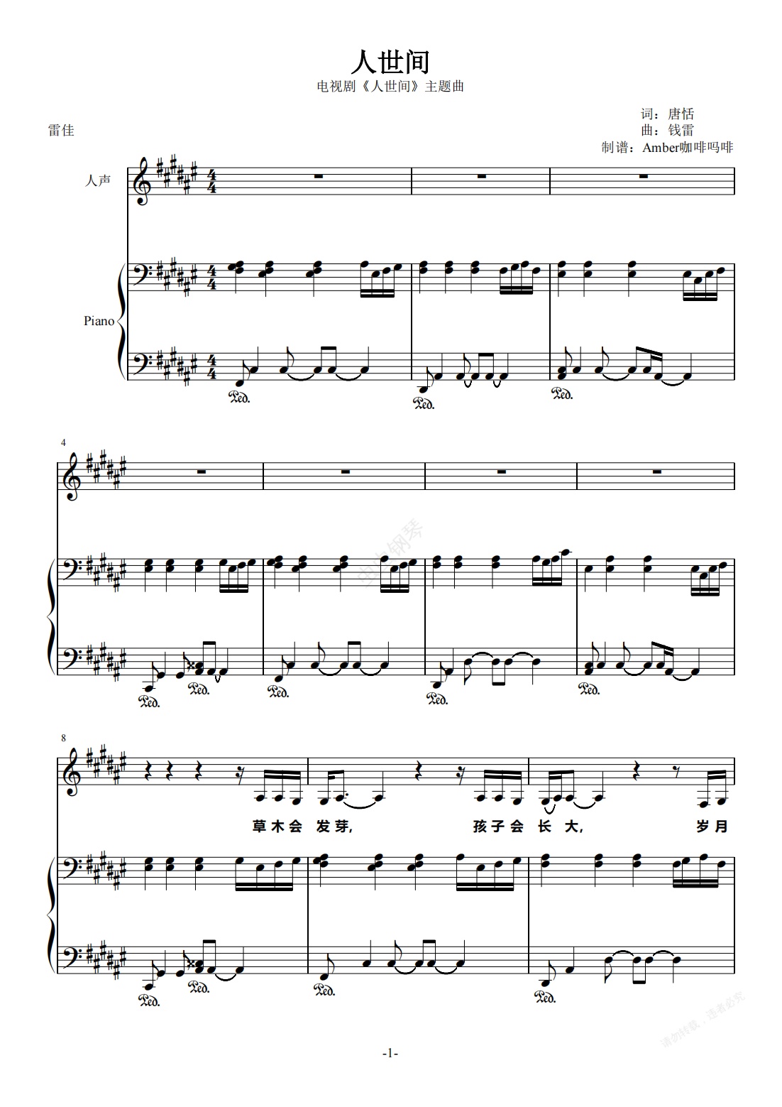 钢琴谱:人世间-雷佳 钢琴伴奏谱