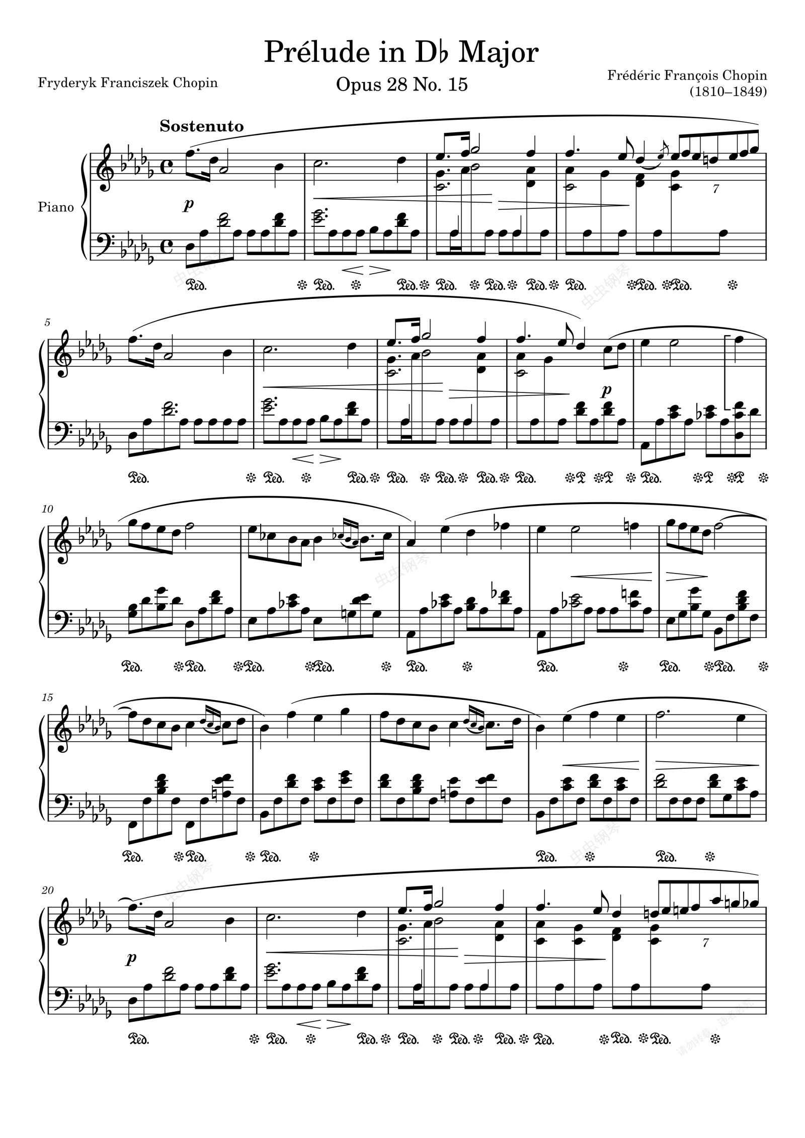 钢琴谱:肖邦降D大调前奏曲 Prélude Opus 28 No. 15 in D♭ Major – Chopin
