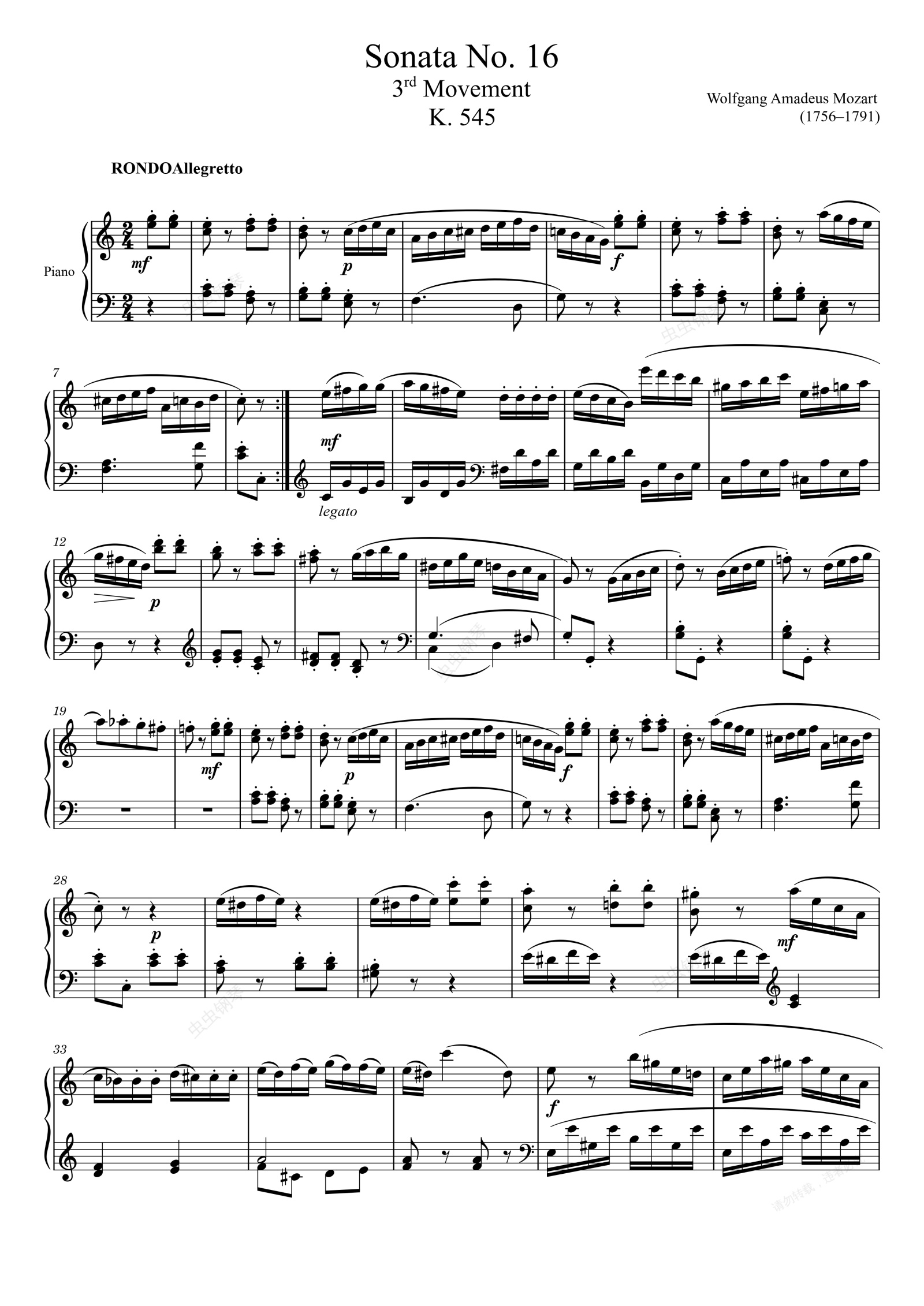 钢琴谱:莫扎特C大调第十六钢琴奏鸣曲 第三乐章Sonata No. 16, 3rd Movement K. 545