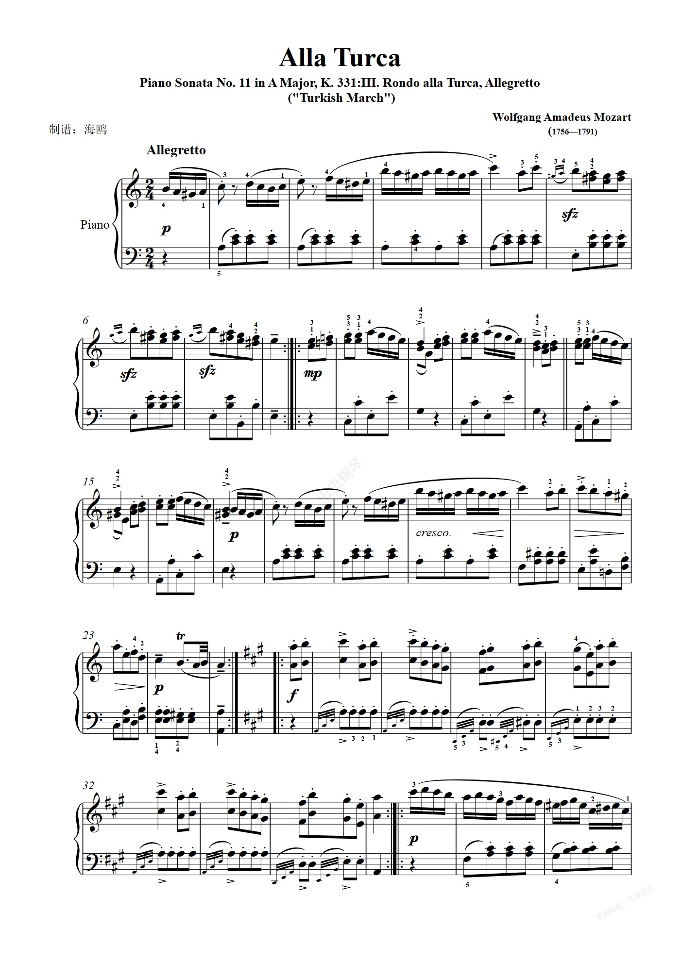 钢琴谱:土耳其进行曲【官方校正版】(Alla Turca 莫扎特 土耳其风回旋曲 Piano Sonata No. 11 in A Major, K. 331:III. Rondo alla Turca, Allegretto ("Turkish March"))