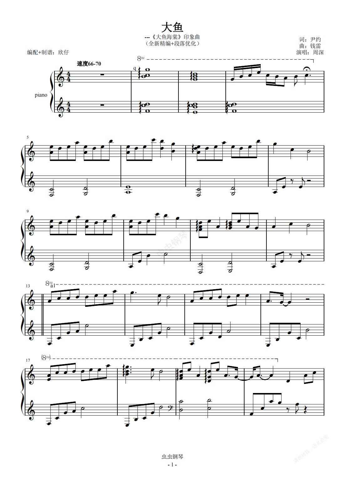 钢琴谱:C调(性价比超高版)《大鱼》(精编回忆版+段落优化)