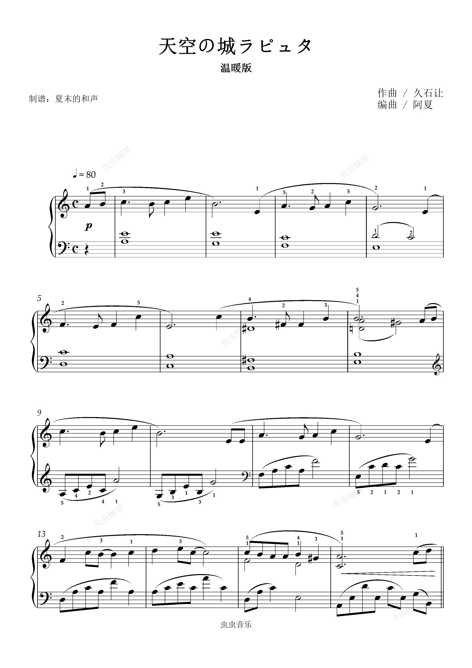 钢琴谱:久石让 - 天空之城(温暖版)- C调简易带指法