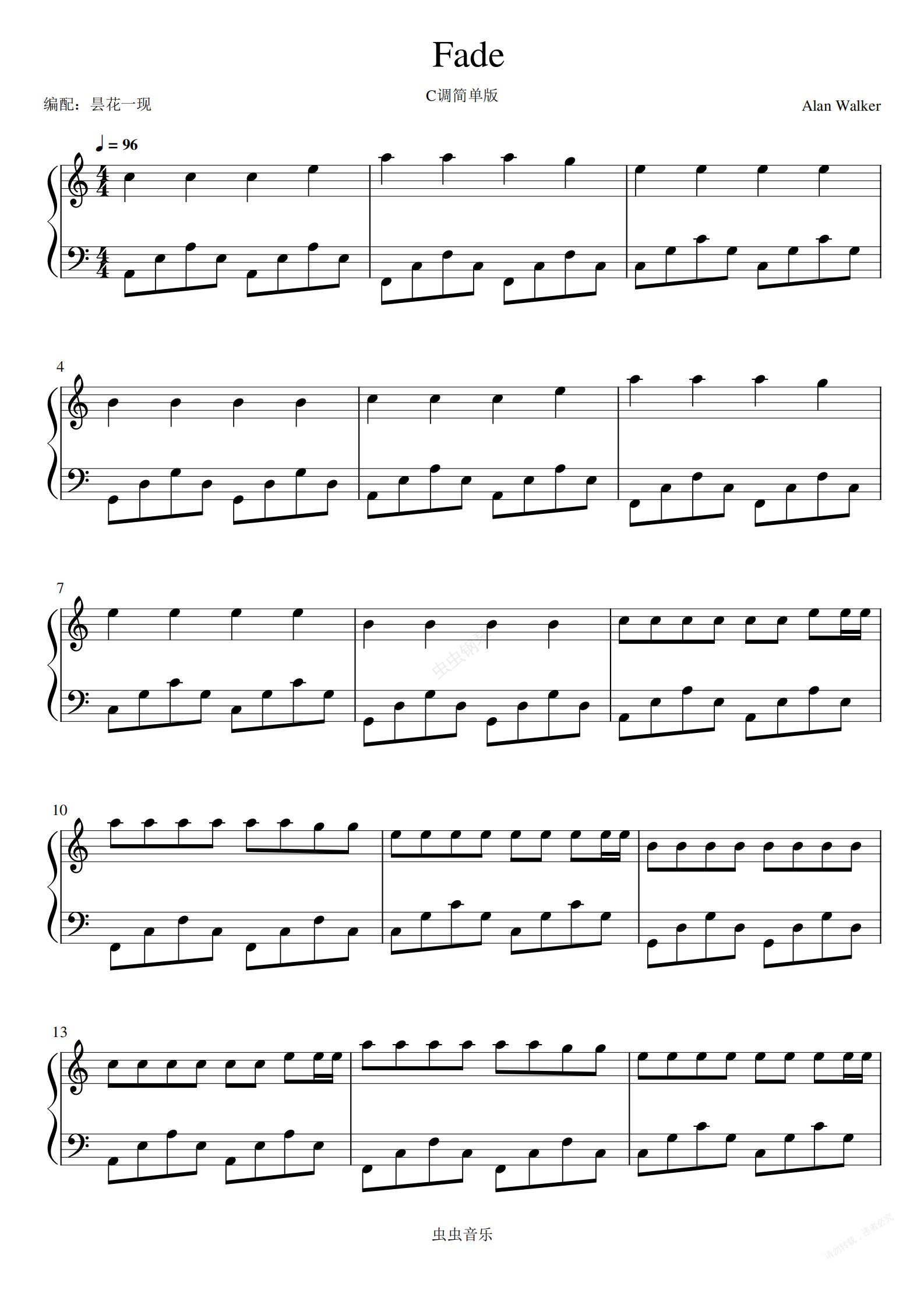 钢琴谱:Fade-C大调简单版(Alan Walker)