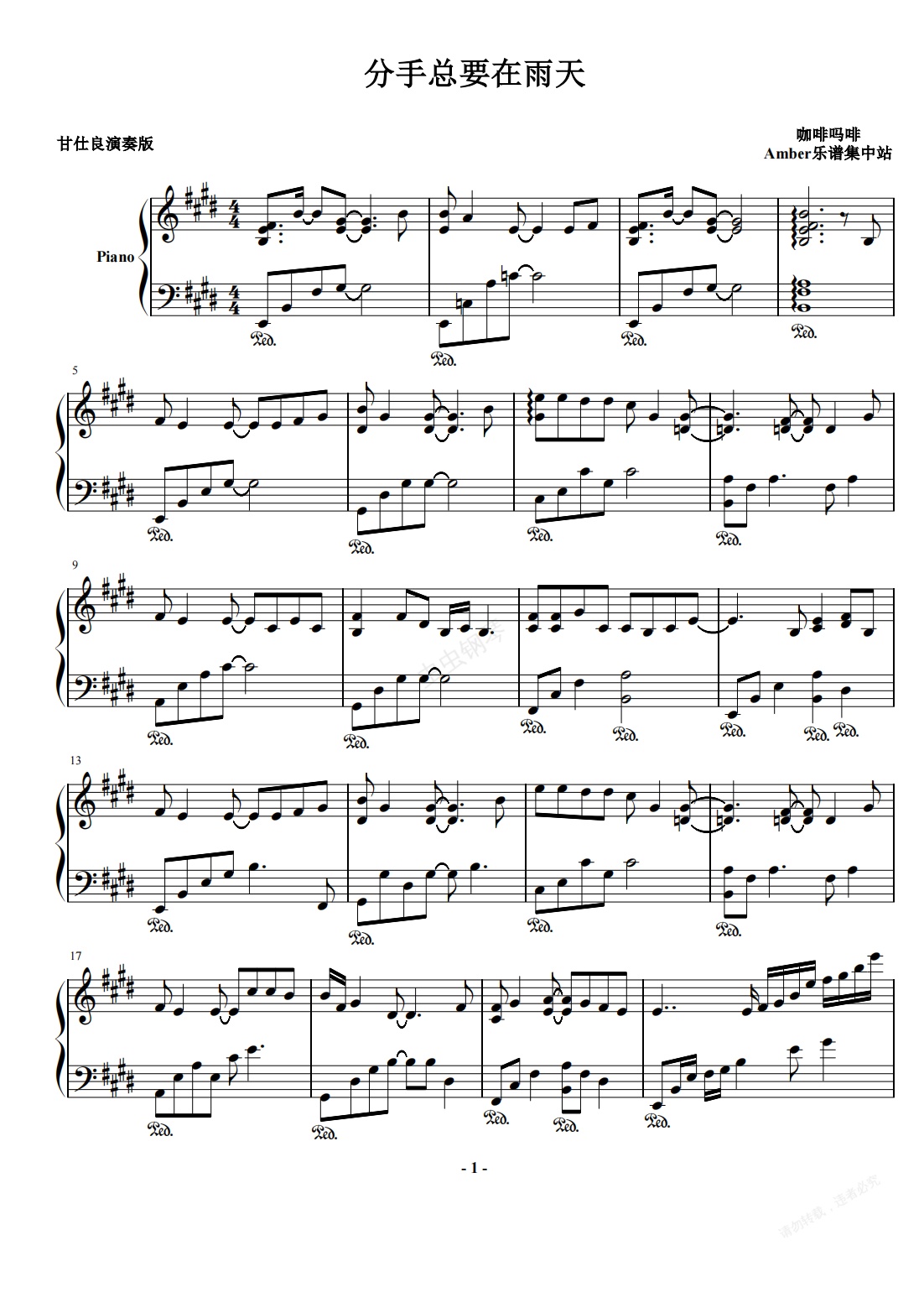 钢琴谱:分手总要在雨天