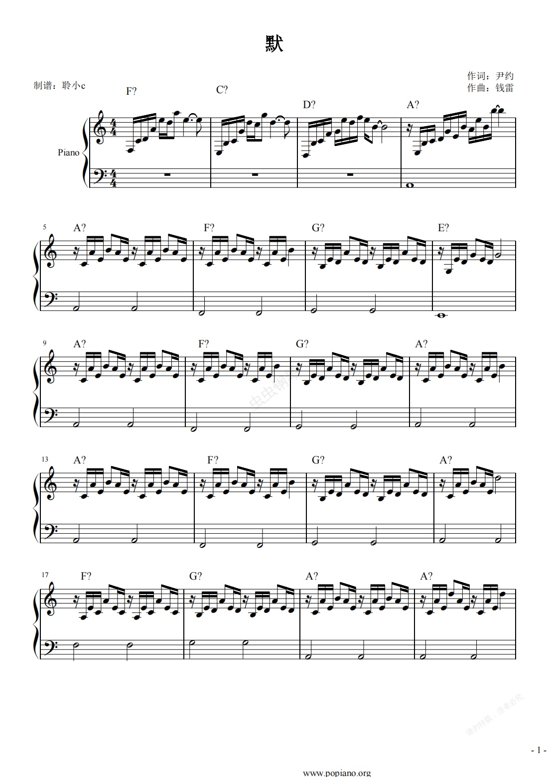 钢琴谱:默 和弦标记版 何以笙箫默 电影