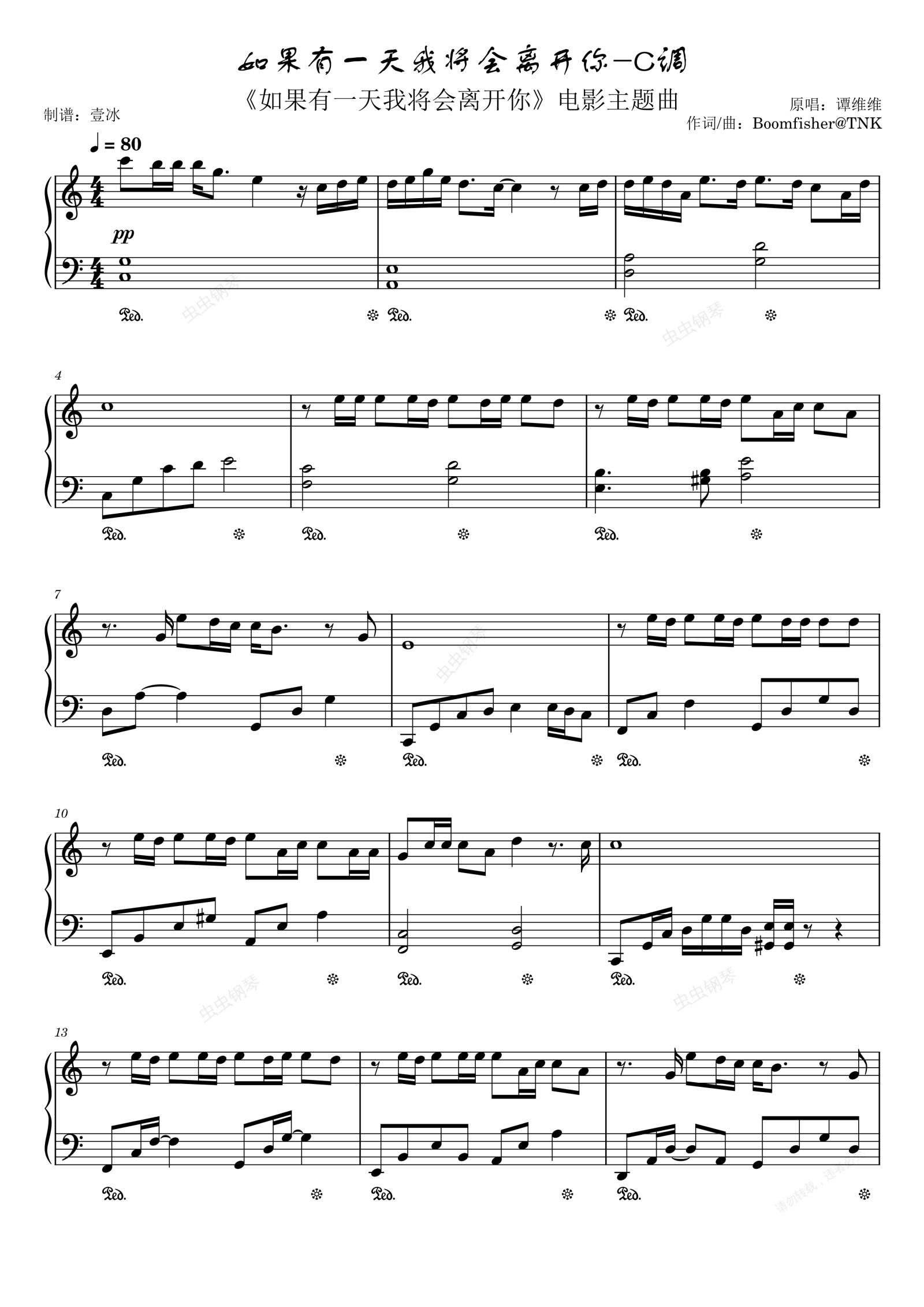 钢琴谱:如果有一天我将会离开你//《如果有一天我将会离开你》电影主题曲-C调