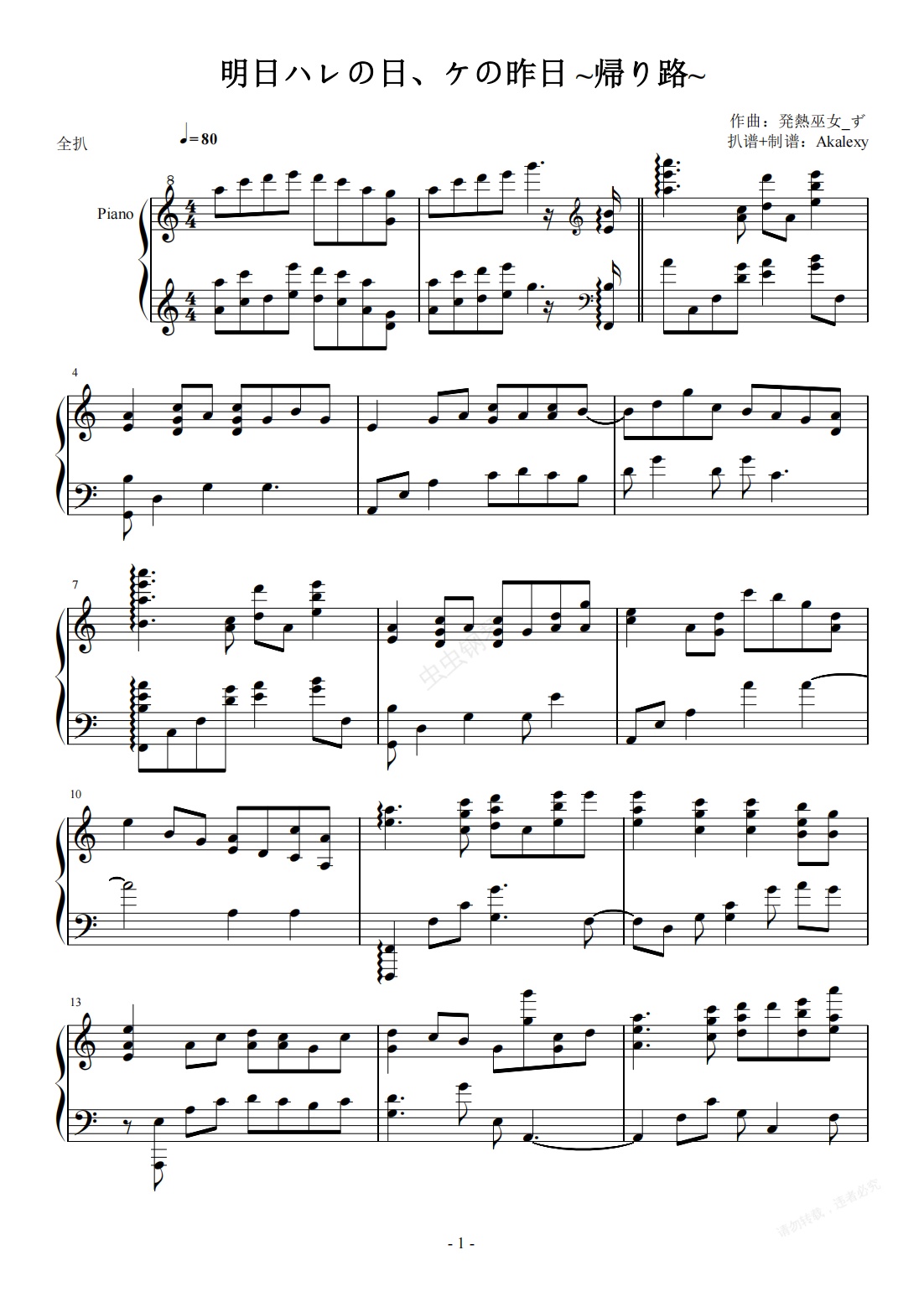 钢琴谱:《明日ハレの日、ケの昨日 ~帰り路~》东方风神录