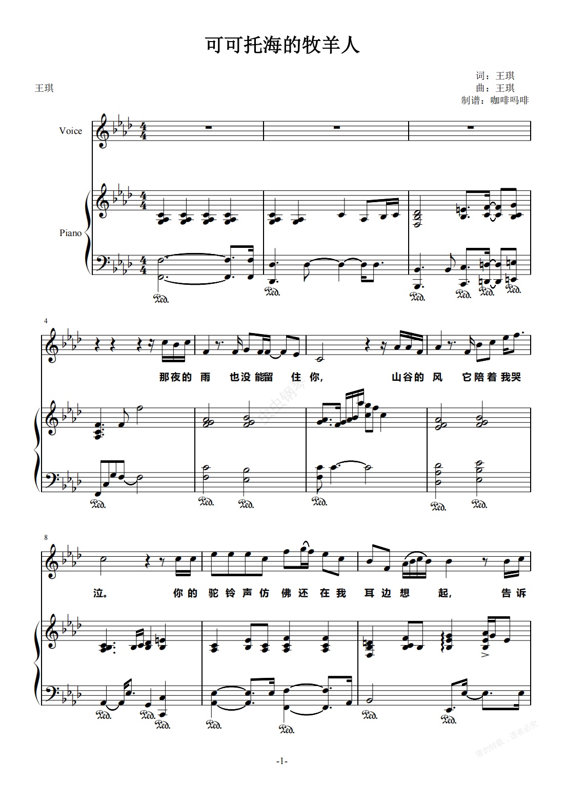 钢琴谱:可可托海的牧羊人-王琪 完美钢琴伴奏谱