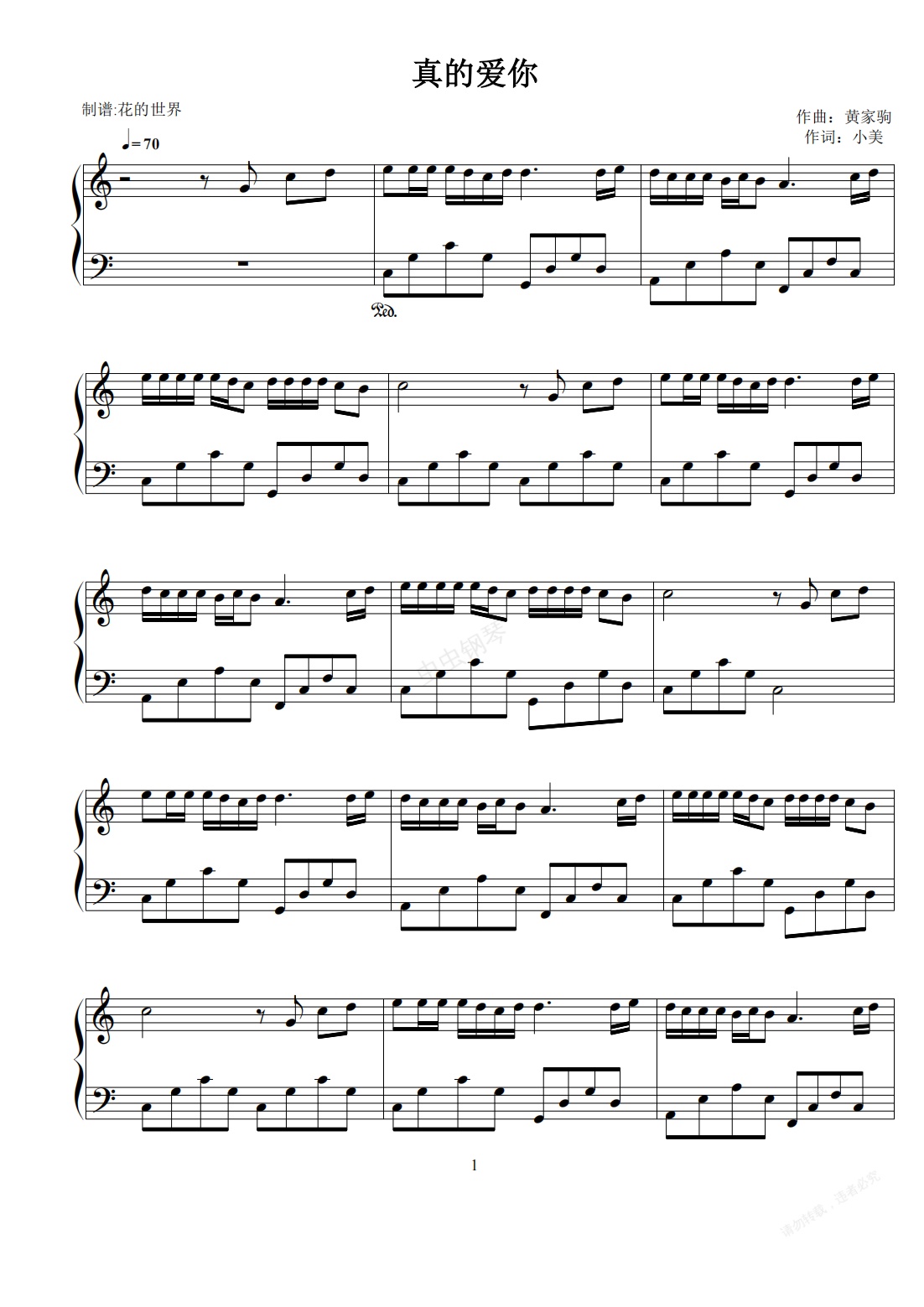 钢琴谱:真的爱你   C调简易版 beyond 黄家驹  流行经典