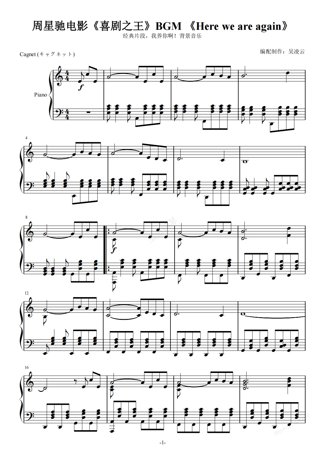 钢琴谱:周星驰电影《喜剧之王》BGM 《Here we are again》 钢琴演奏版
