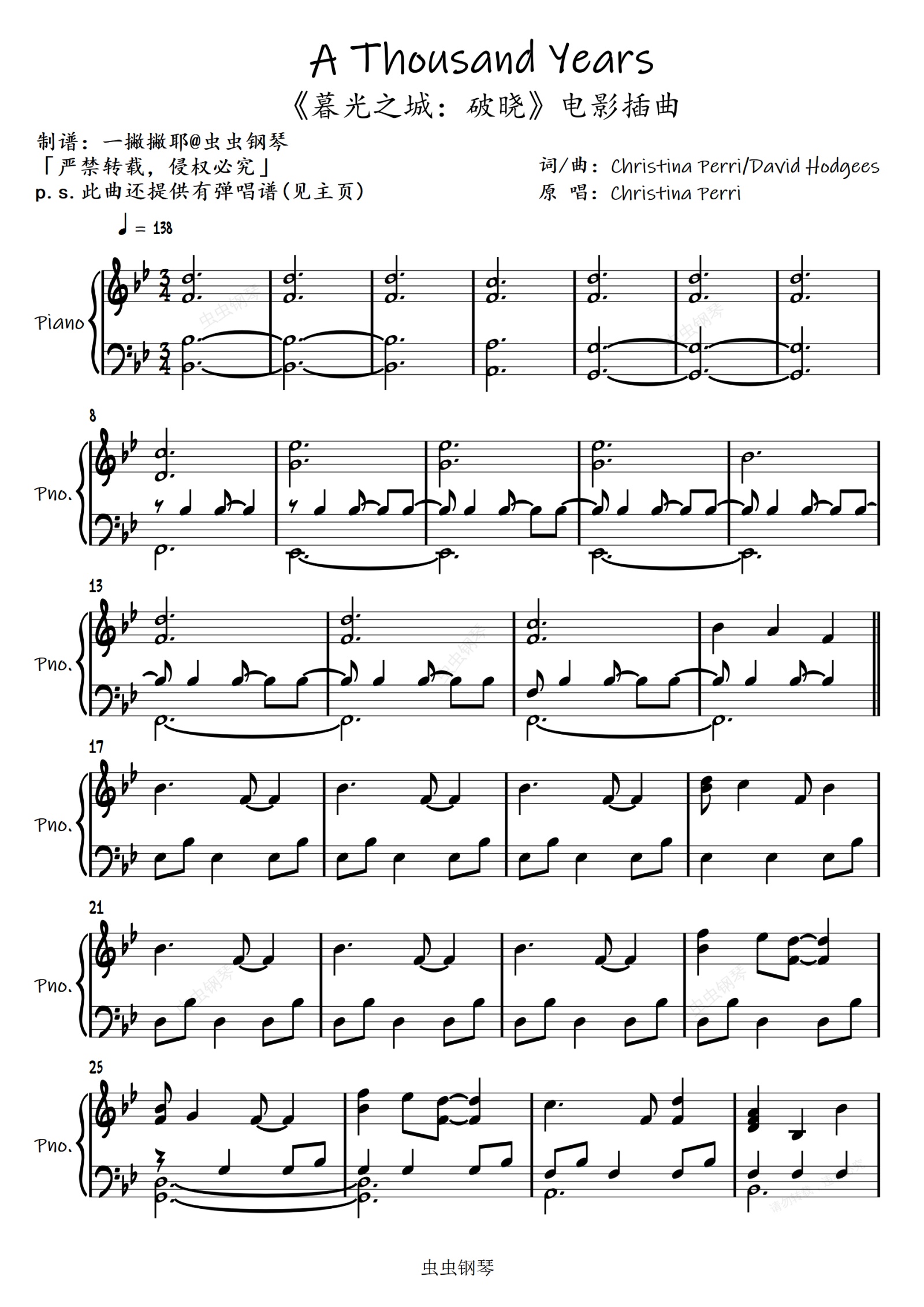 钢琴谱:【完美独奏】A Thousand Years《暮光之城》「一撇撇耶」