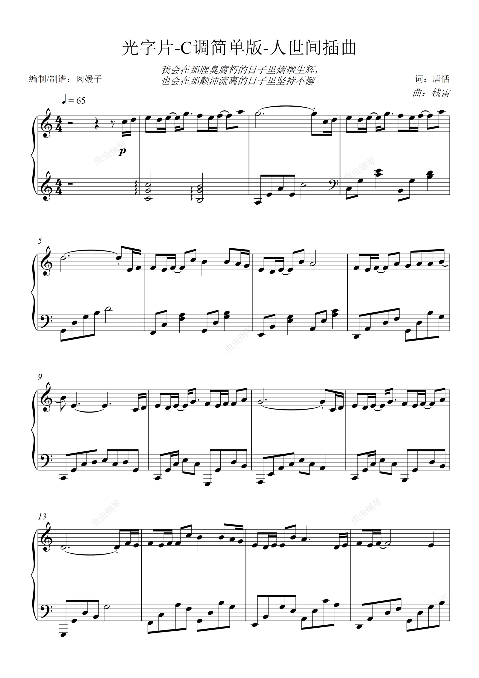 钢琴谱:人世间插曲 光字片- 【超优美简单钢琴独奏版】