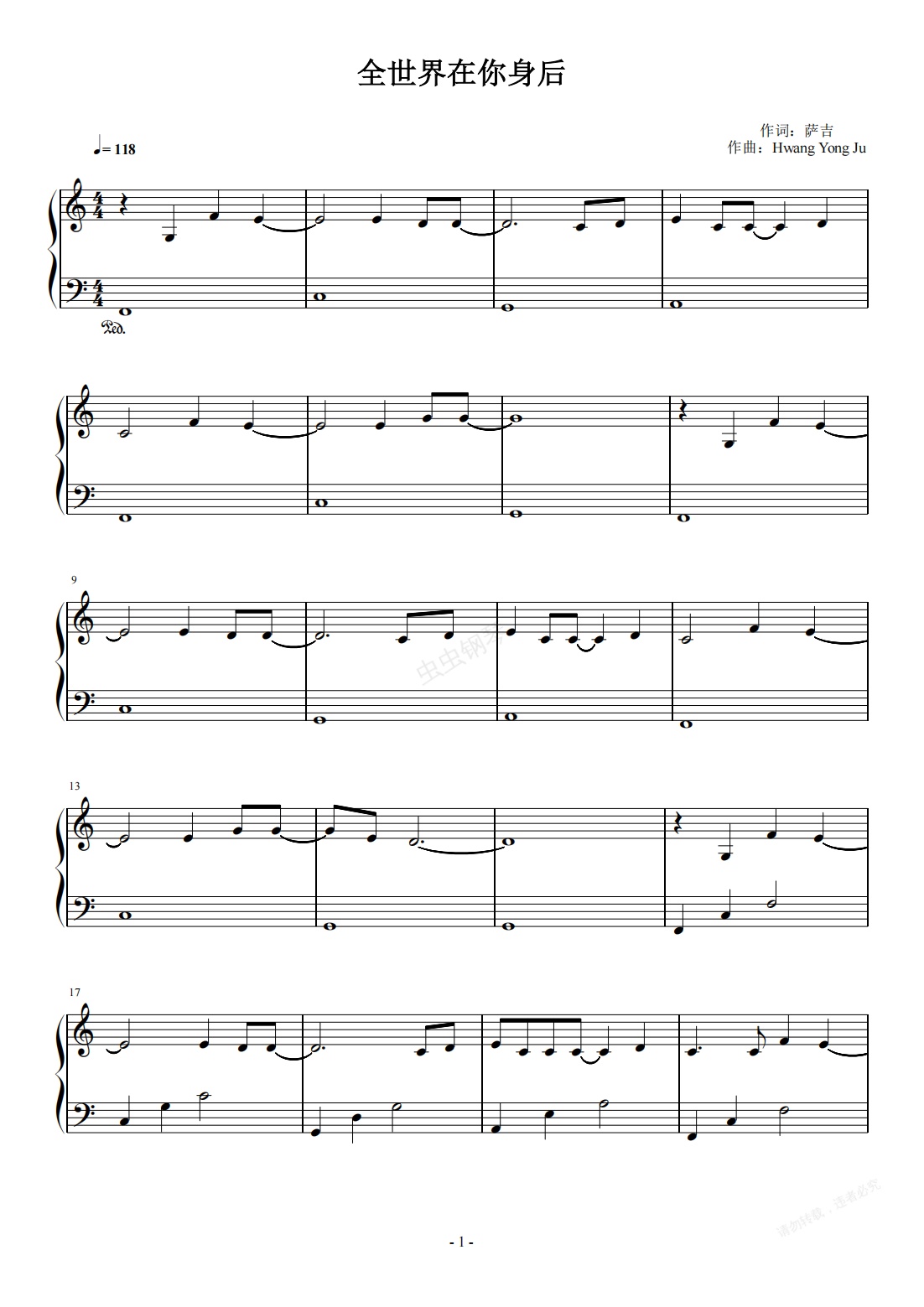 钢琴谱:全世界在你身后 C调简易版 Hwang Yong Ju  电视剧《一闪一闪亮晶晶》歌曲