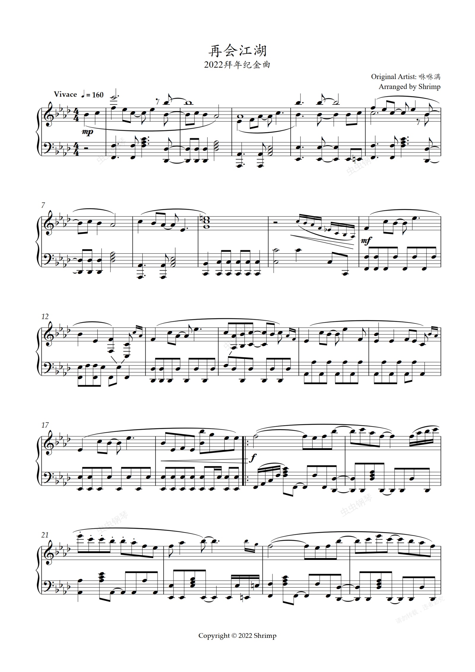 钢琴谱:再会江湖 2022拜年纪金曲