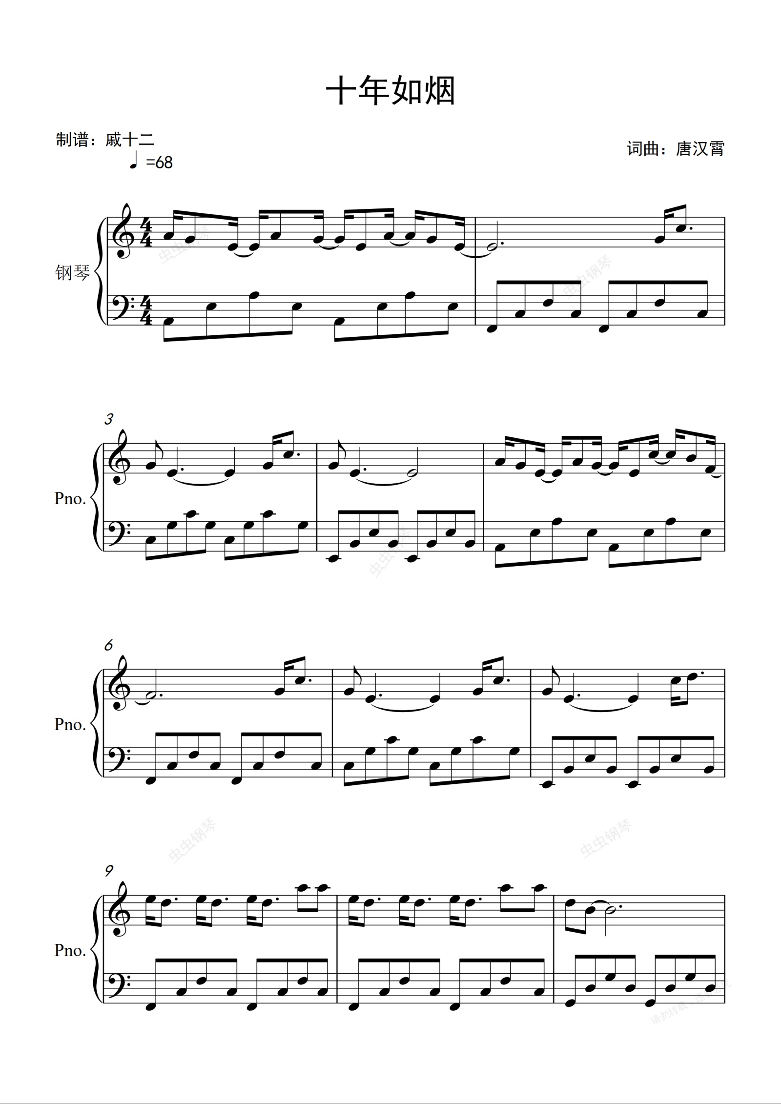 钢琴谱:十年如烟-C调简单版十年一品温如言主题曲