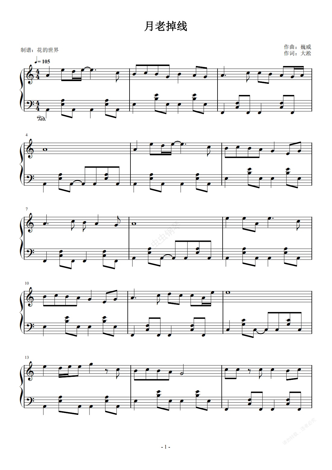 钢琴谱:月老掉线 C调简易版 王不醒