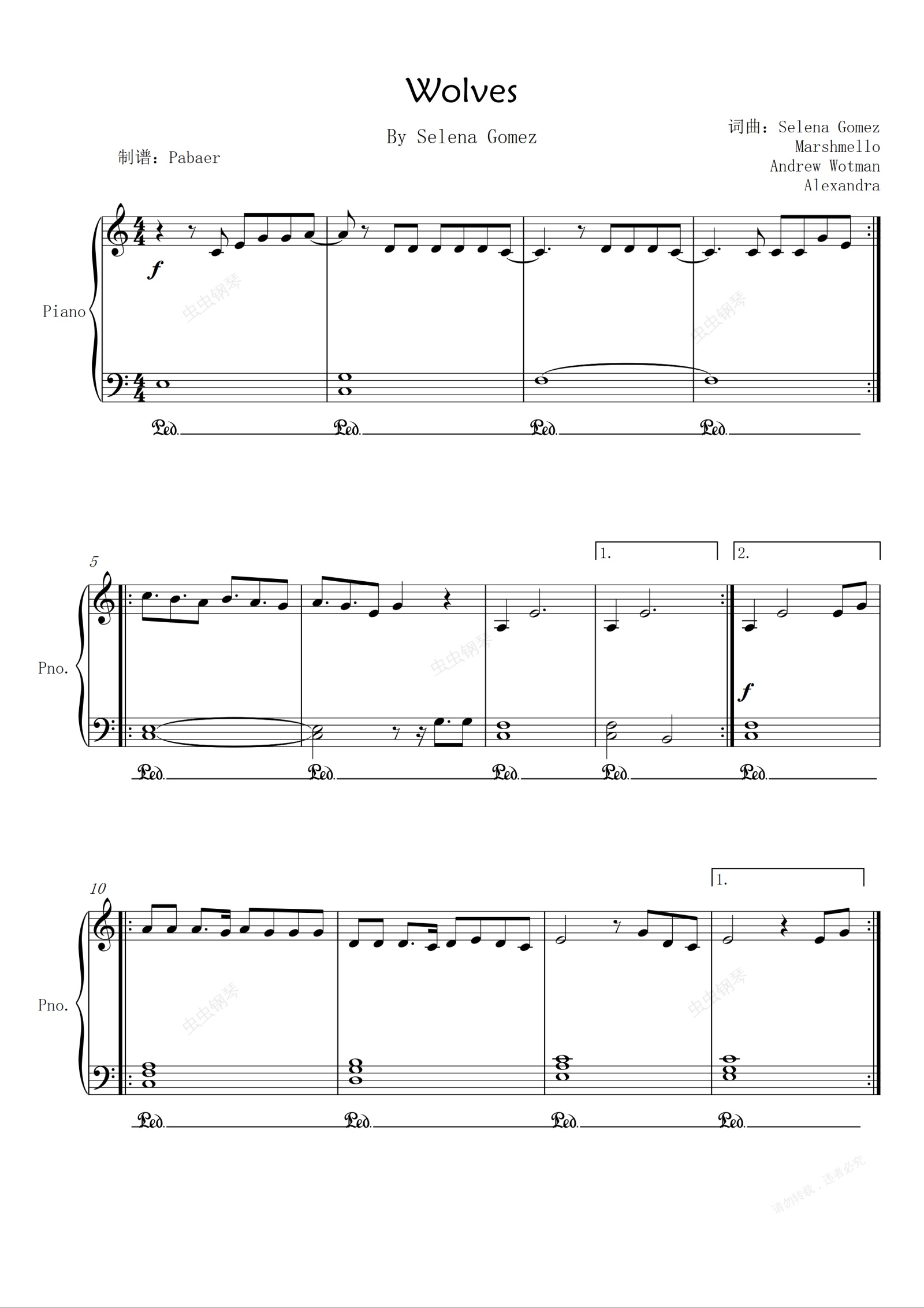 钢琴谱:Wolves(C调独奏极简版)