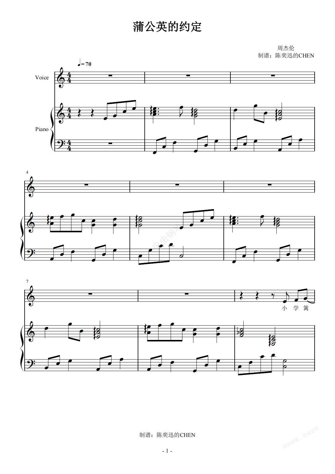 钢琴谱:蒲公英的约定 完美弹唱谱【附歌词】