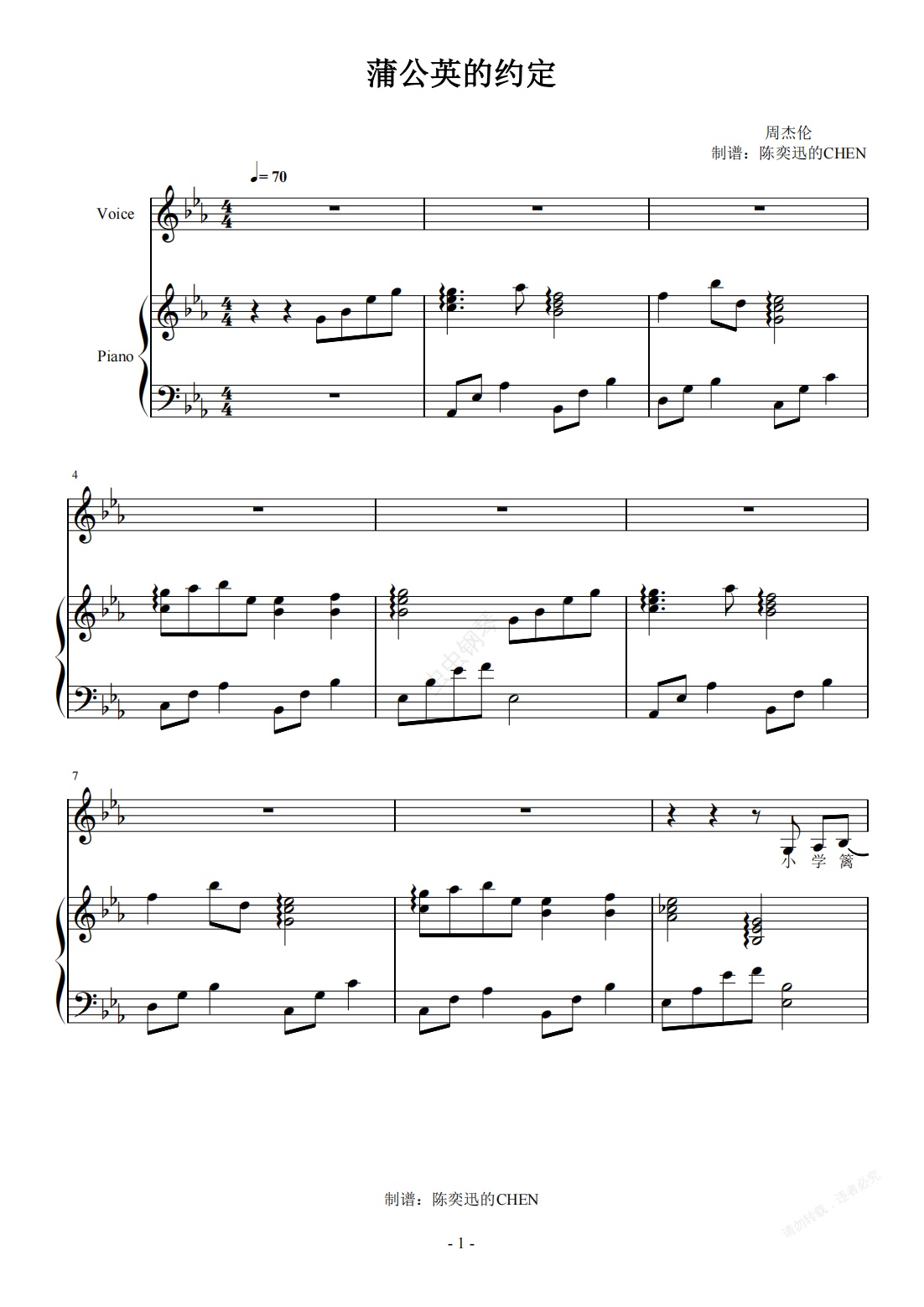 钢琴谱:蒲公英的约定 完美弹唱谱【附歌词】