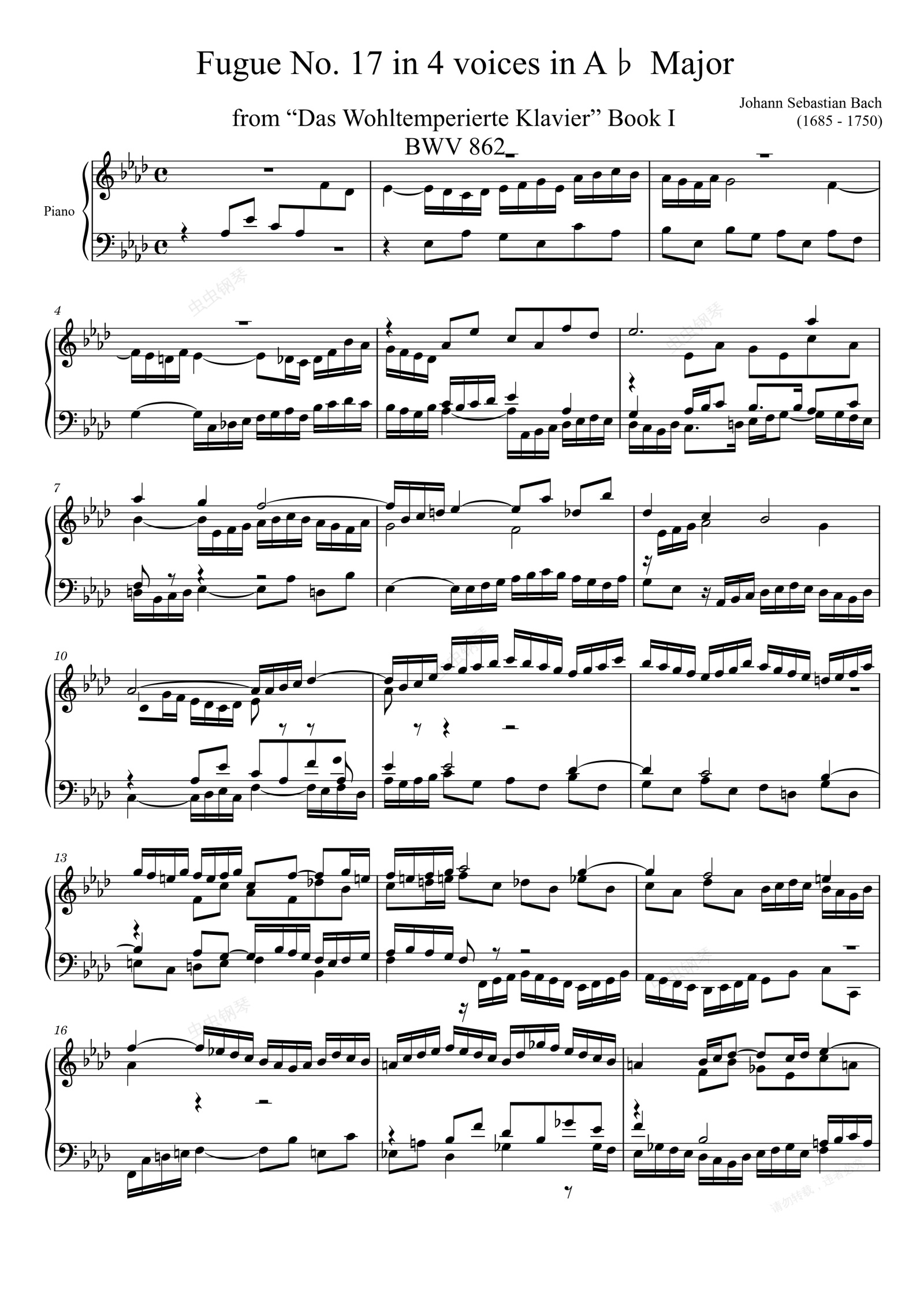 钢琴谱:Fugue No. 17 BWV 862 in A♭ Major