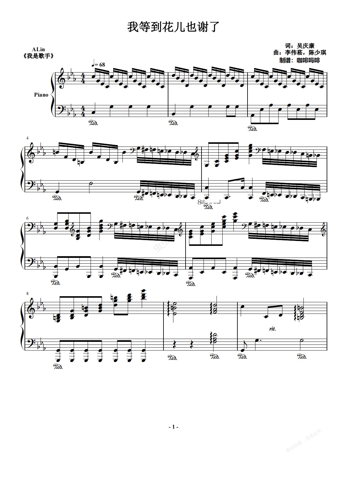 钢琴谱:我等到花儿也谢了-ALin《我是歌手》版钢琴伴奏谱
