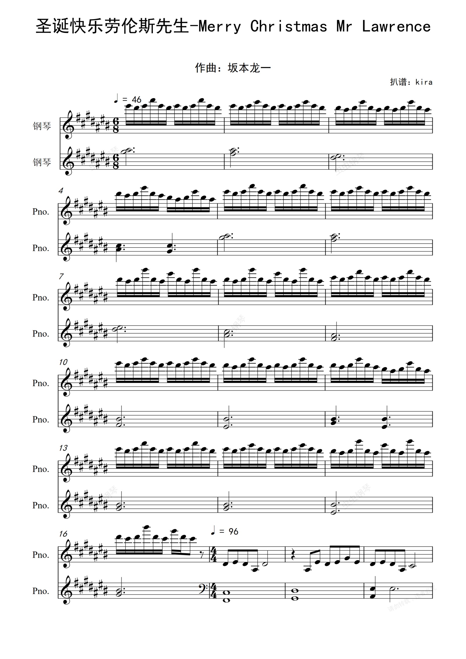 《圣诞快乐,劳伦斯先生》,英文《Merry Mr.》,是坂本龙一为大岛渚的同名电影谱写的,是他电影配乐的处女作,也是他最经典的作品之一。