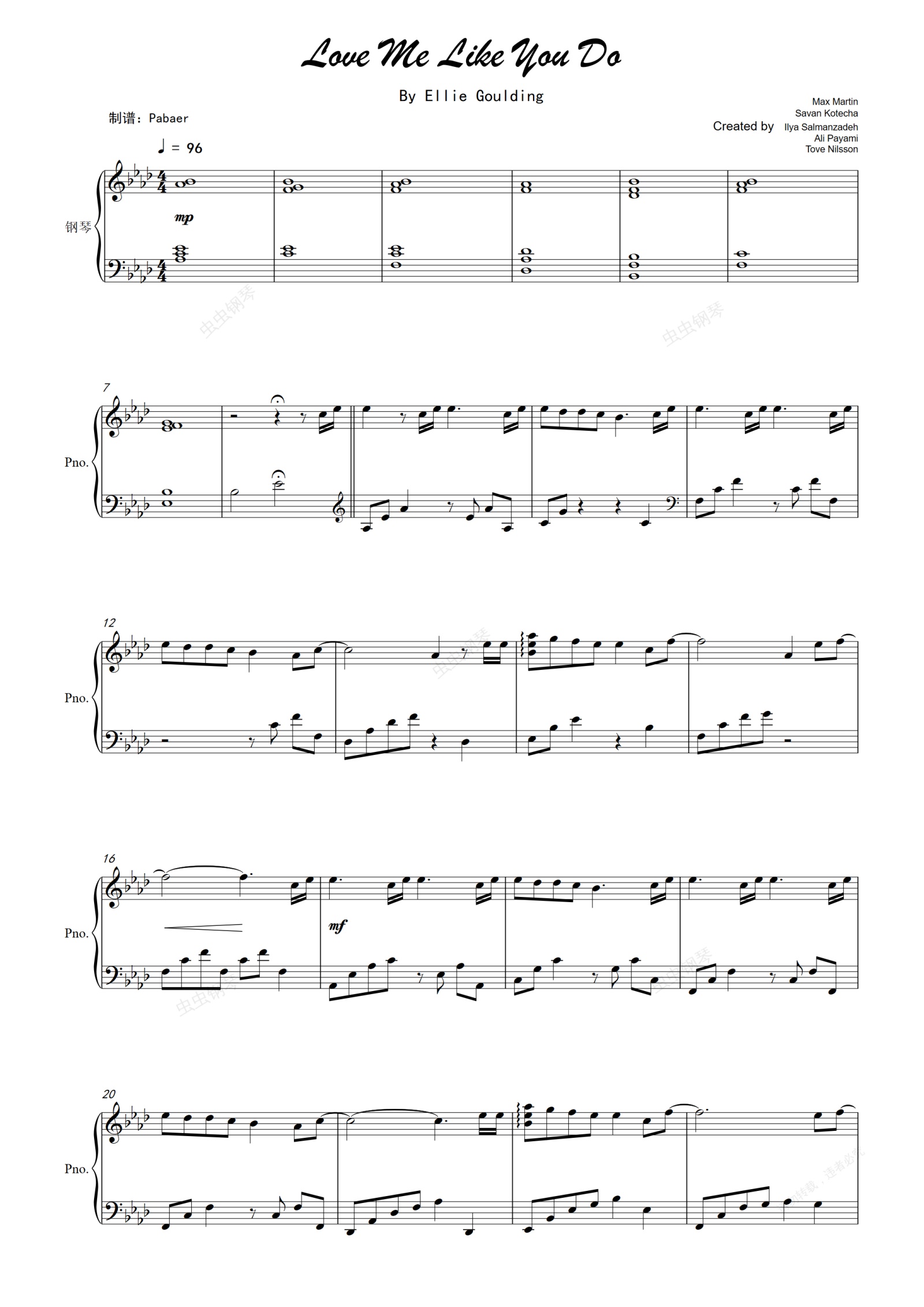 钢琴谱:Love Me Like You Do(电影《五十度灰》的主题曲独奏版)