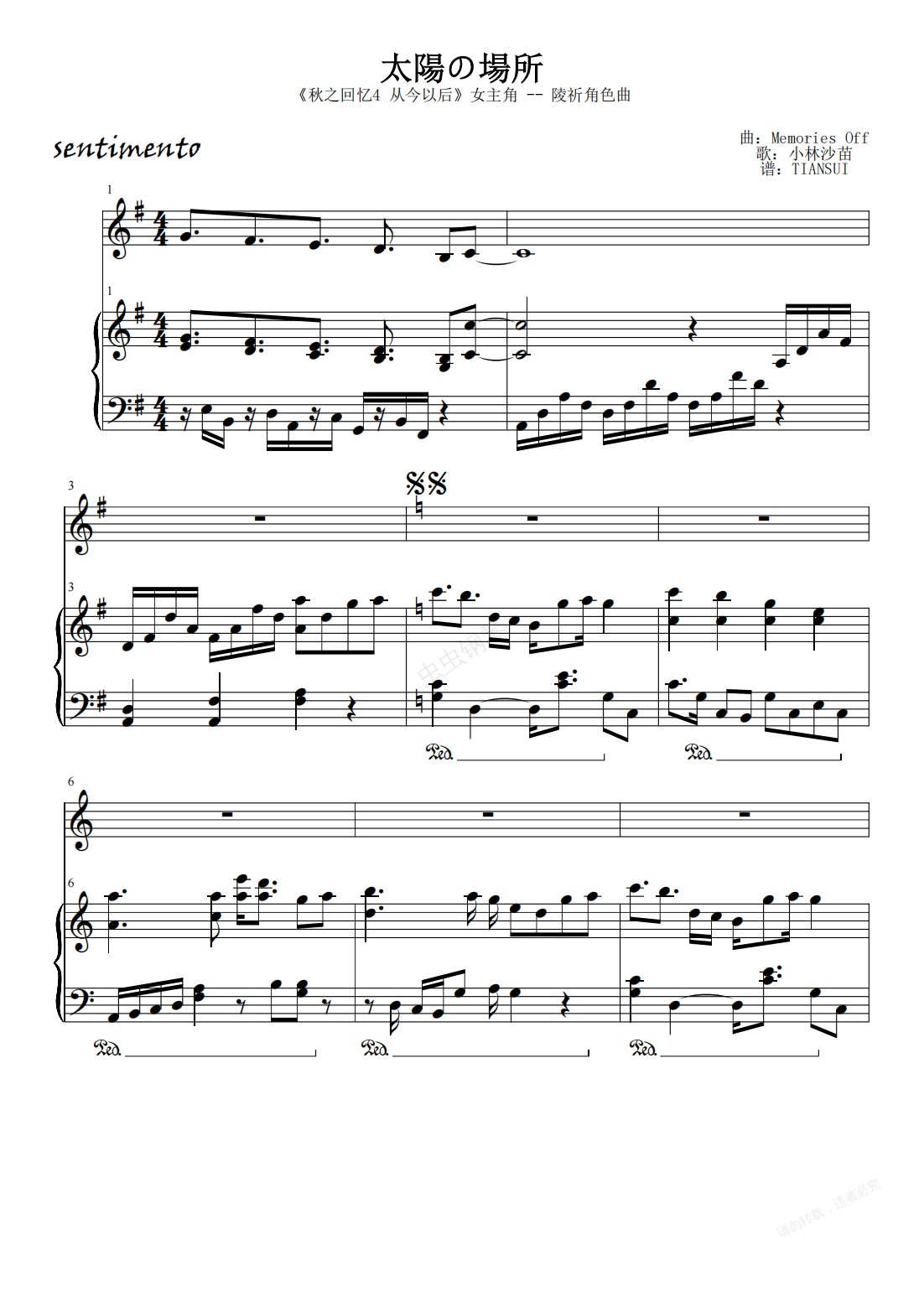钢琴谱:太陽の場所 《秋之回忆4》陵祈 角色曲