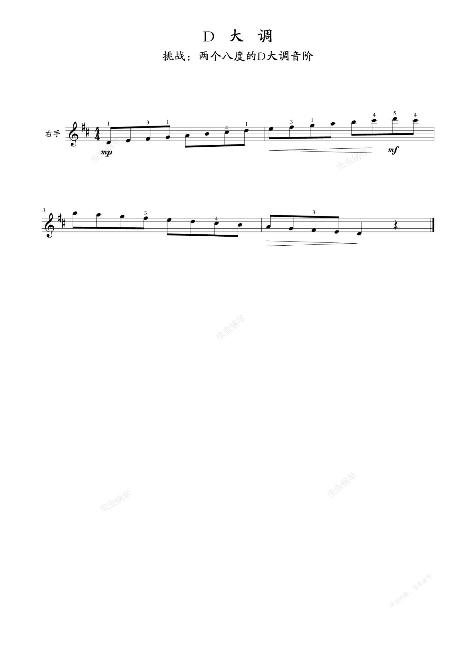 钢琴谱:7-1.5. 两个八度的D大调音阶(右手)