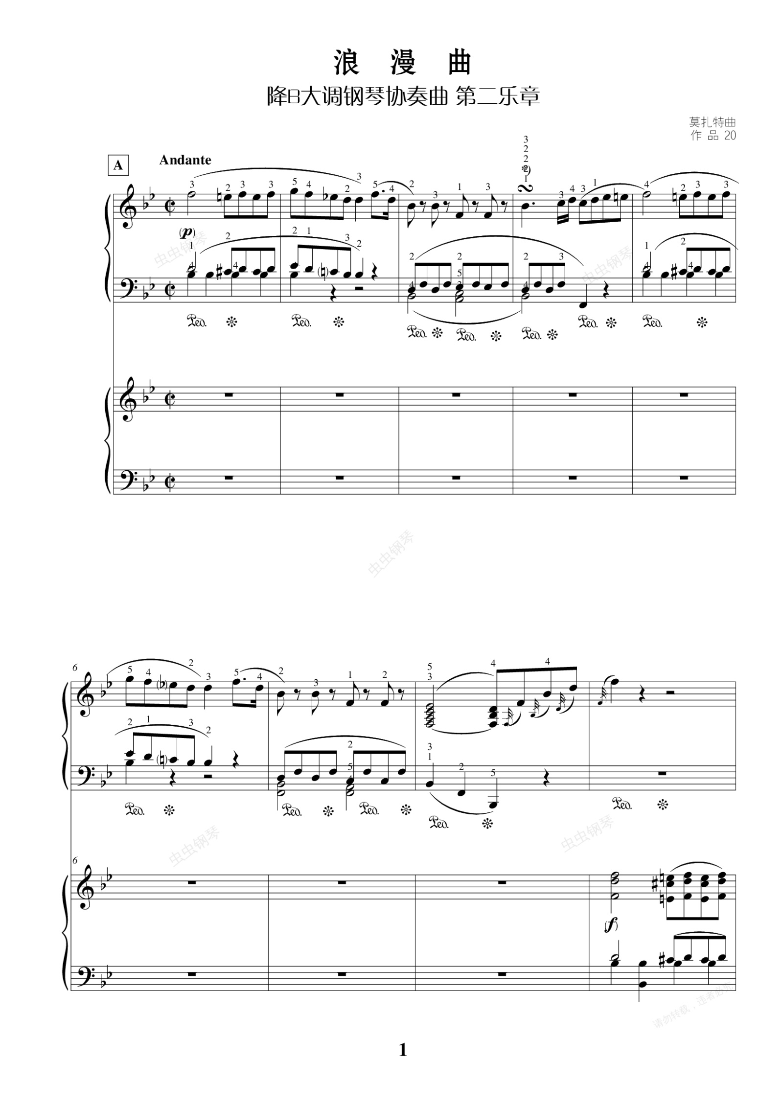 钢琴谱:26. 浪漫曲(作品20 降B大调钢琴协奏曲 第二乐章)Piano 1