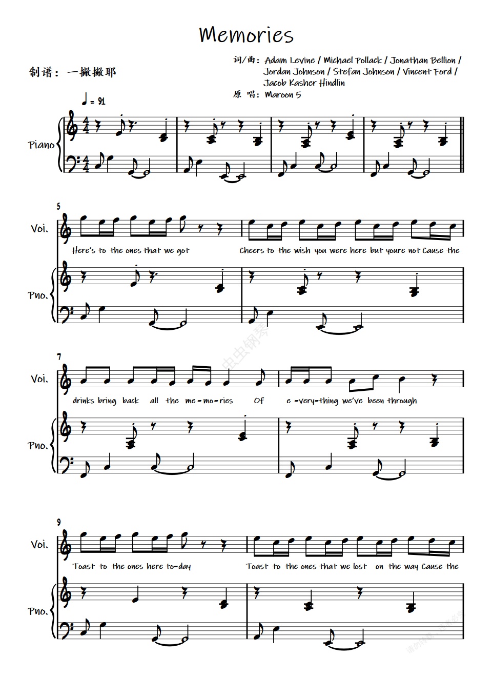 钢琴谱:Memories - Maroon 5 (Piano-Voice)