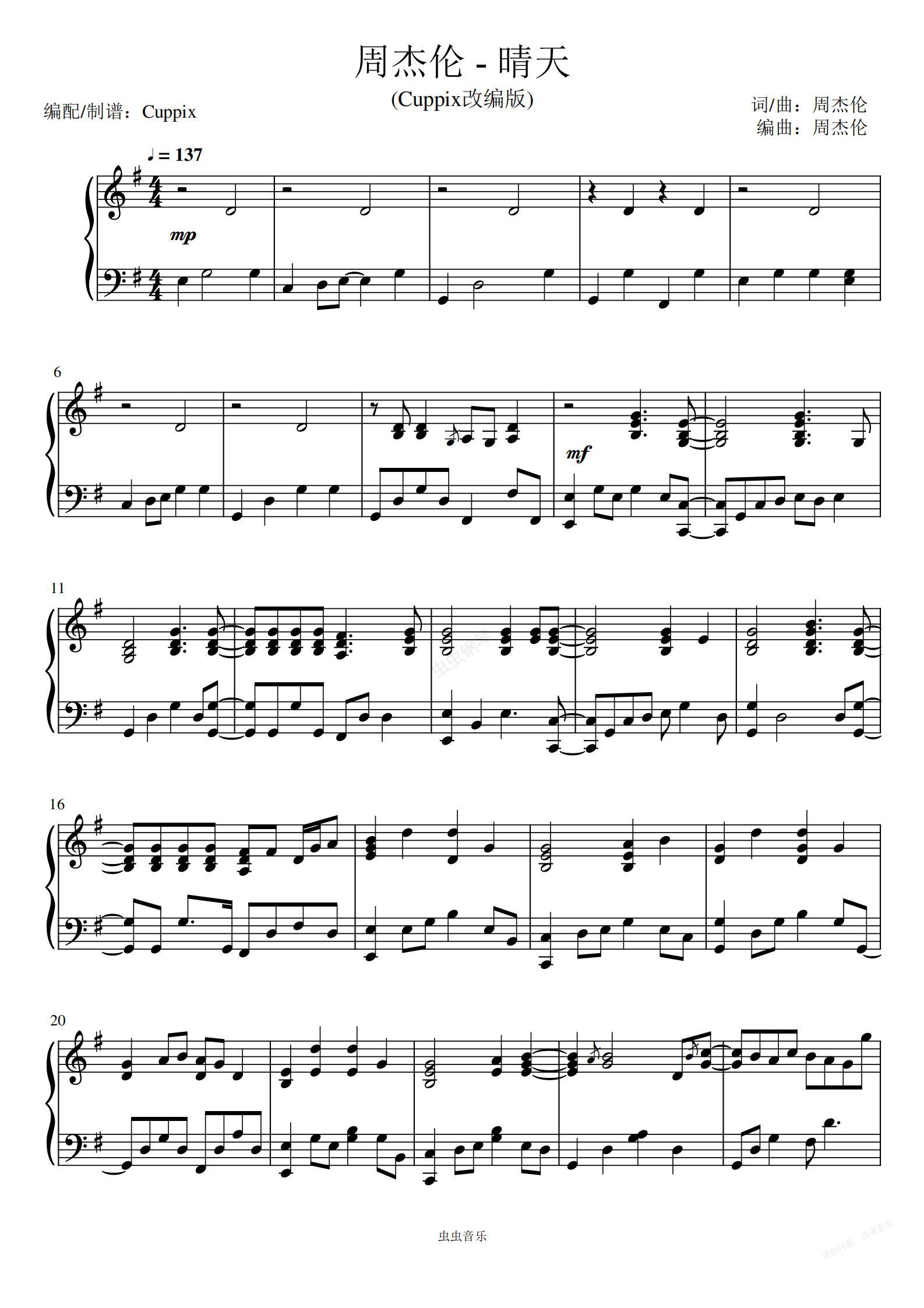 钢琴谱:周杰倫:晴天 鋼琴譜