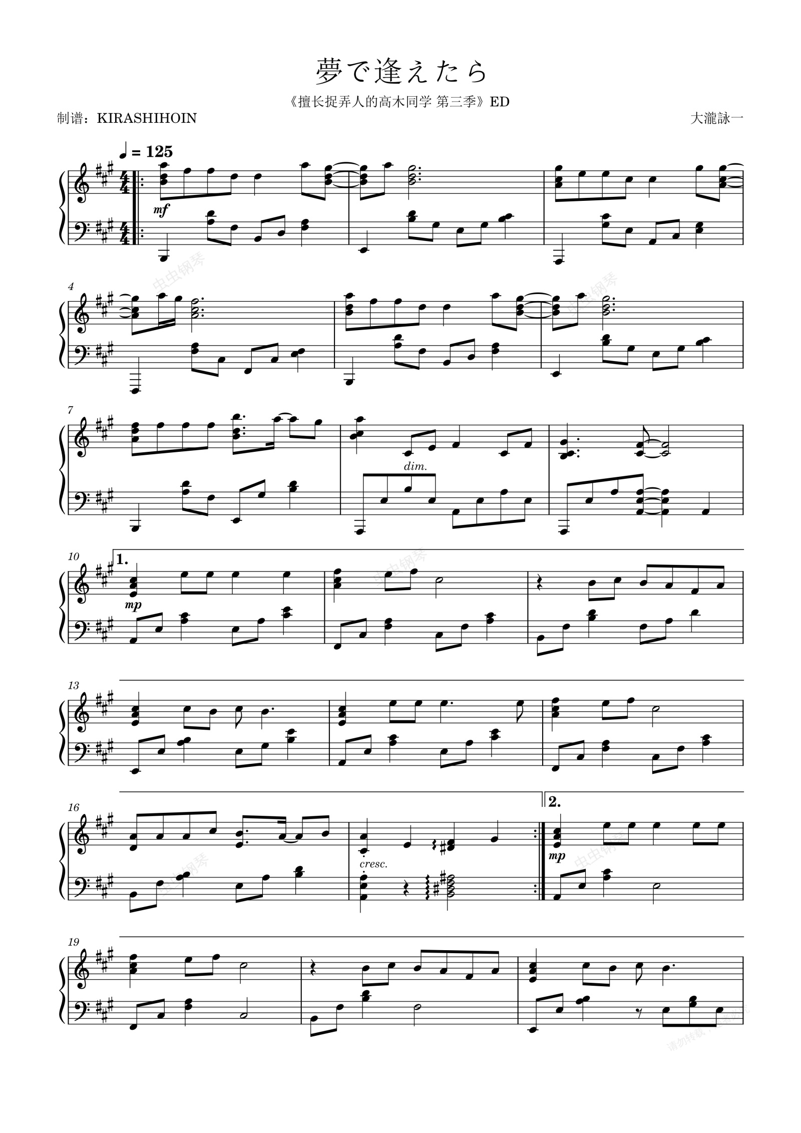 钢琴谱:夢で逢えたら/若能在梦中相见(《擅长捉弄人的高木同学 第三季》ED/片尾曲)- 高桥李依