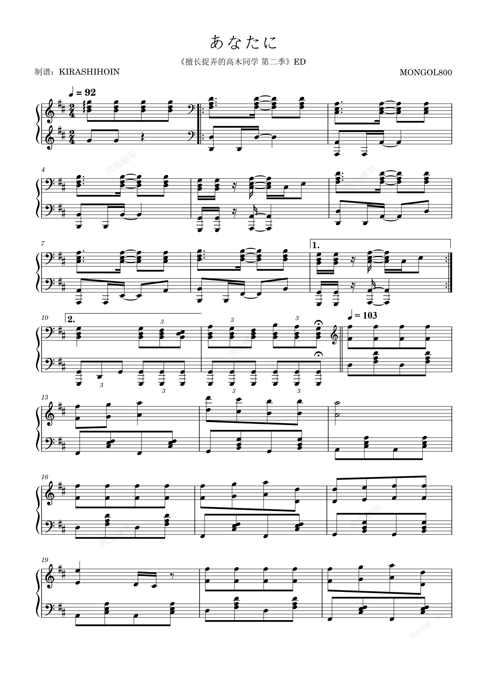 钢琴谱:あなたに(《擅长捉弄的高木同学 第二季》ED/片尾曲)- MONGOL800