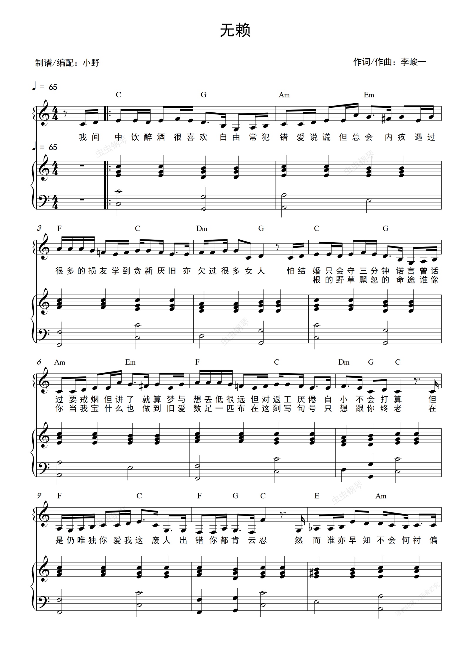 钢琴谱:无赖(和弦弹唱版)