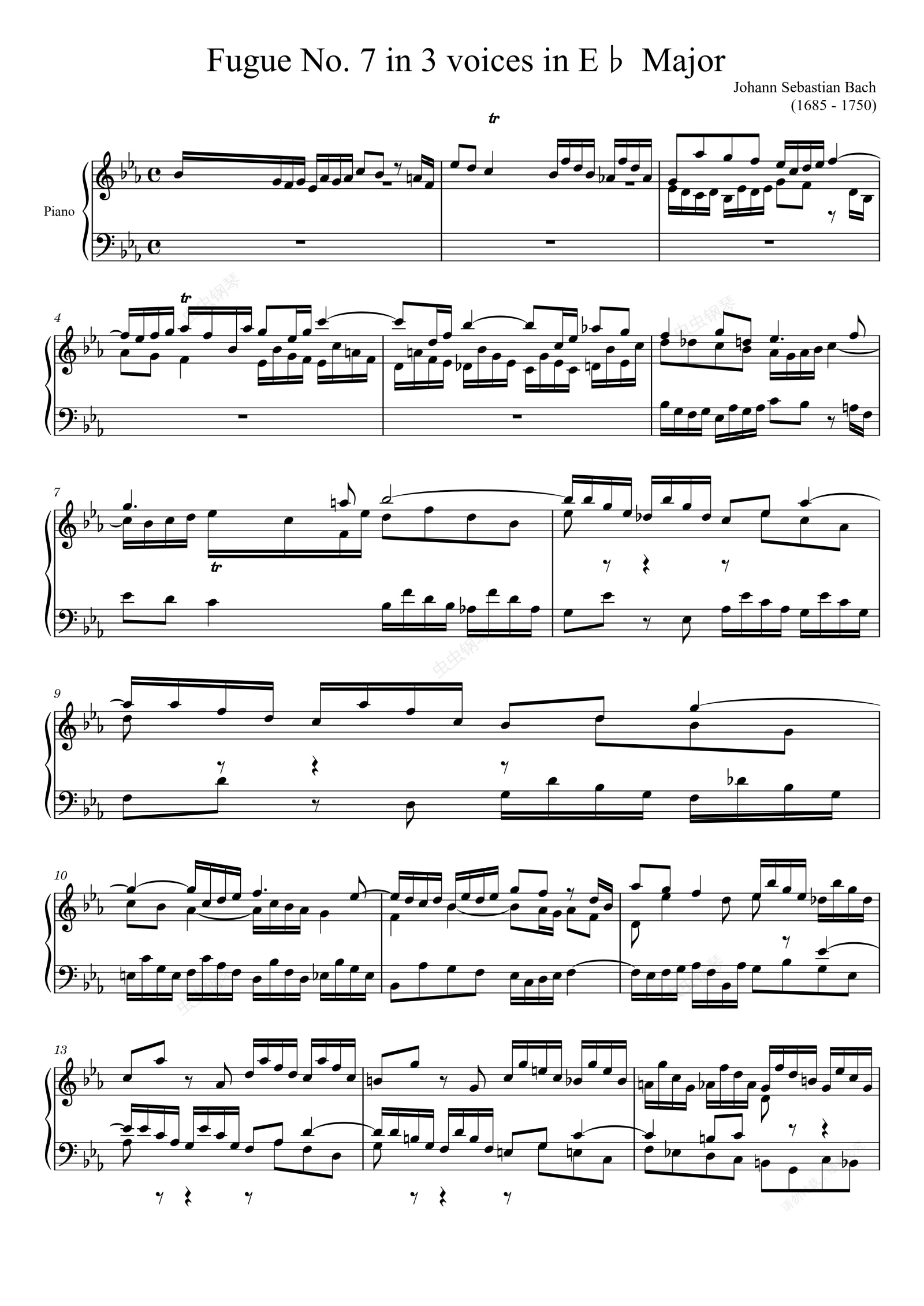 钢琴谱:Fugue No. 7 BWV 852 in E♭ Major