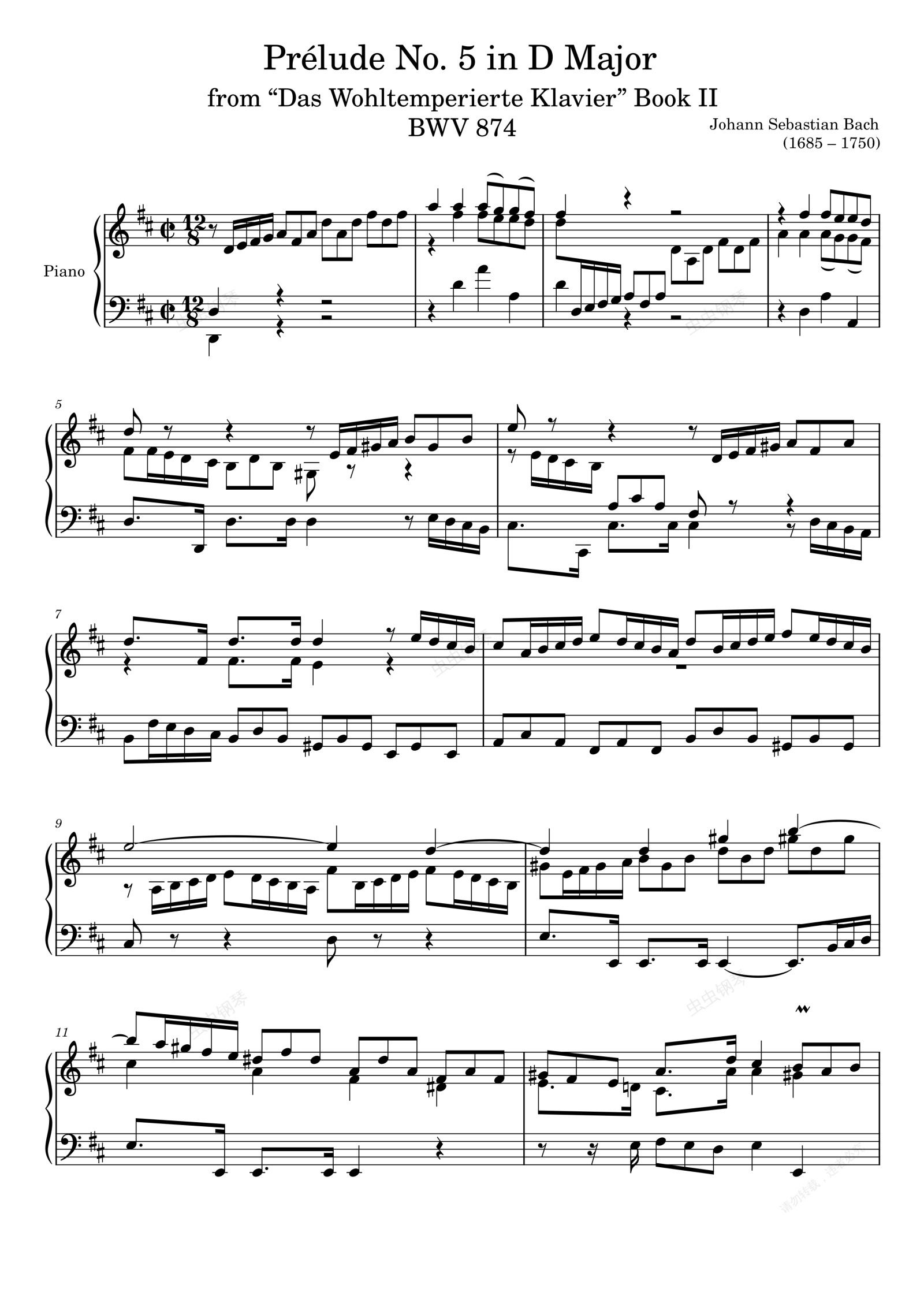 钢琴谱:Prélude No. 5 BWV 874 in D Major
