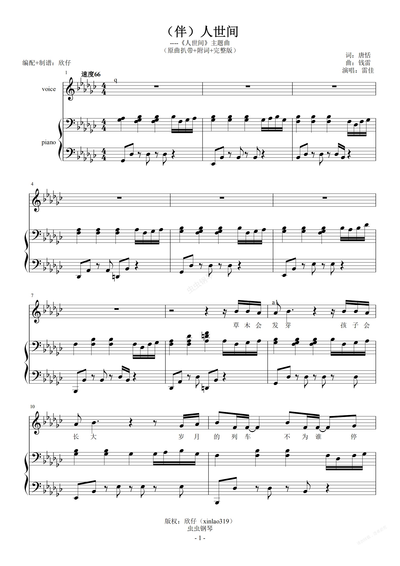 钢琴谱:(伴)雷佳-降G《人世间》(原声扒带+附词+完整版)
