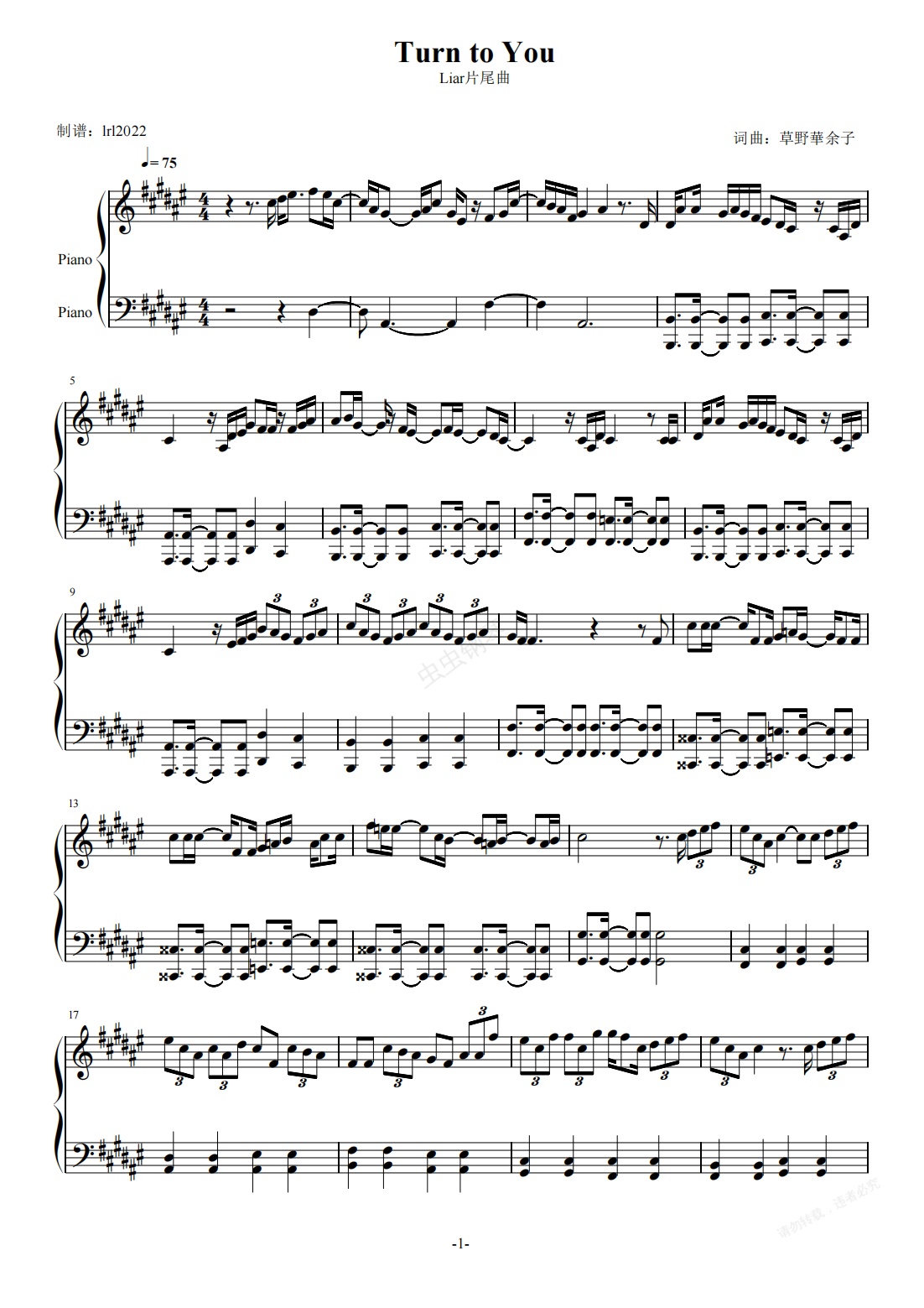 钢琴谱:Turn to You-日剧-Liar-片尾曲-钢琴谱