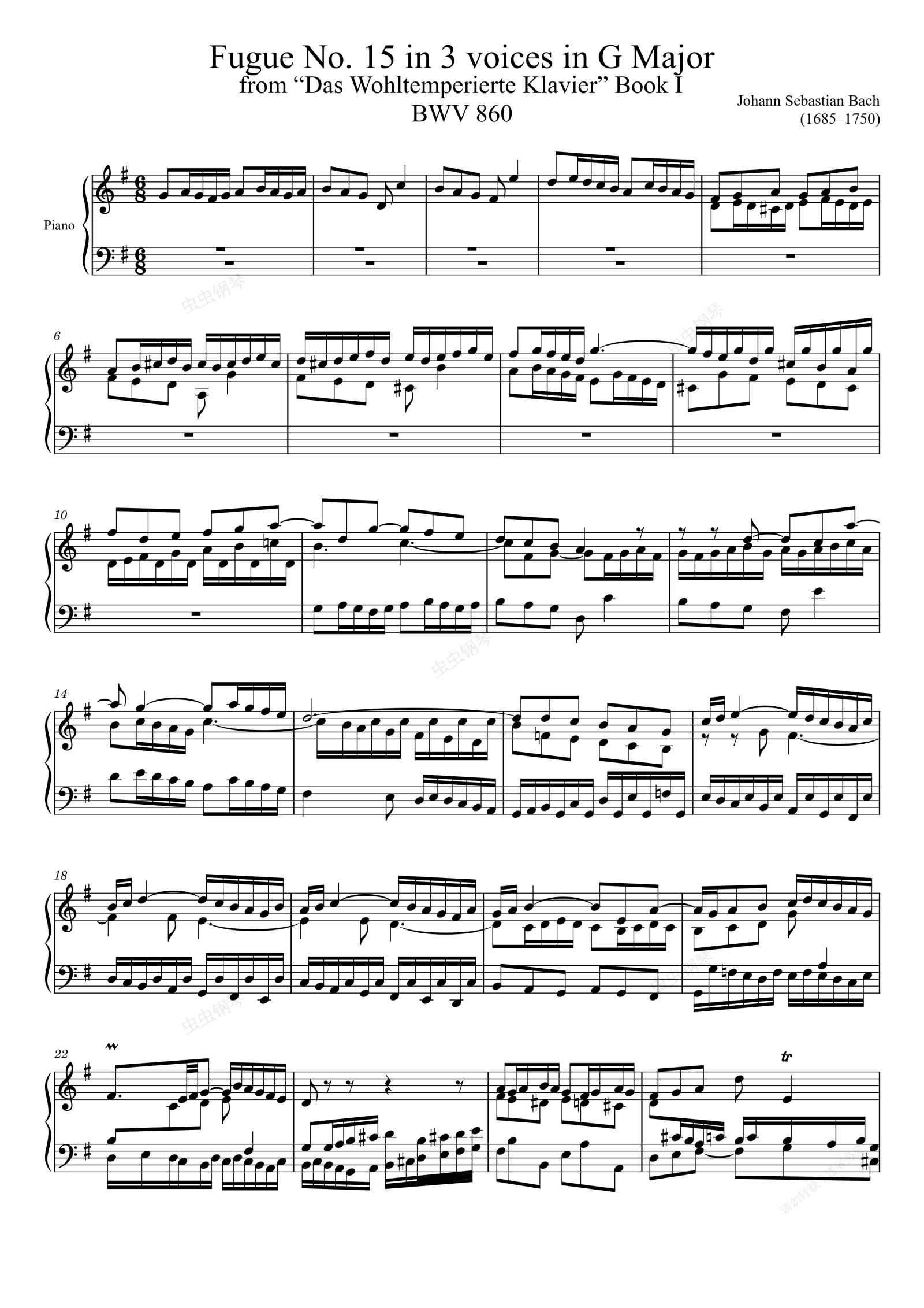 钢琴谱:Fugue No. 15 BWV 860 in G Major