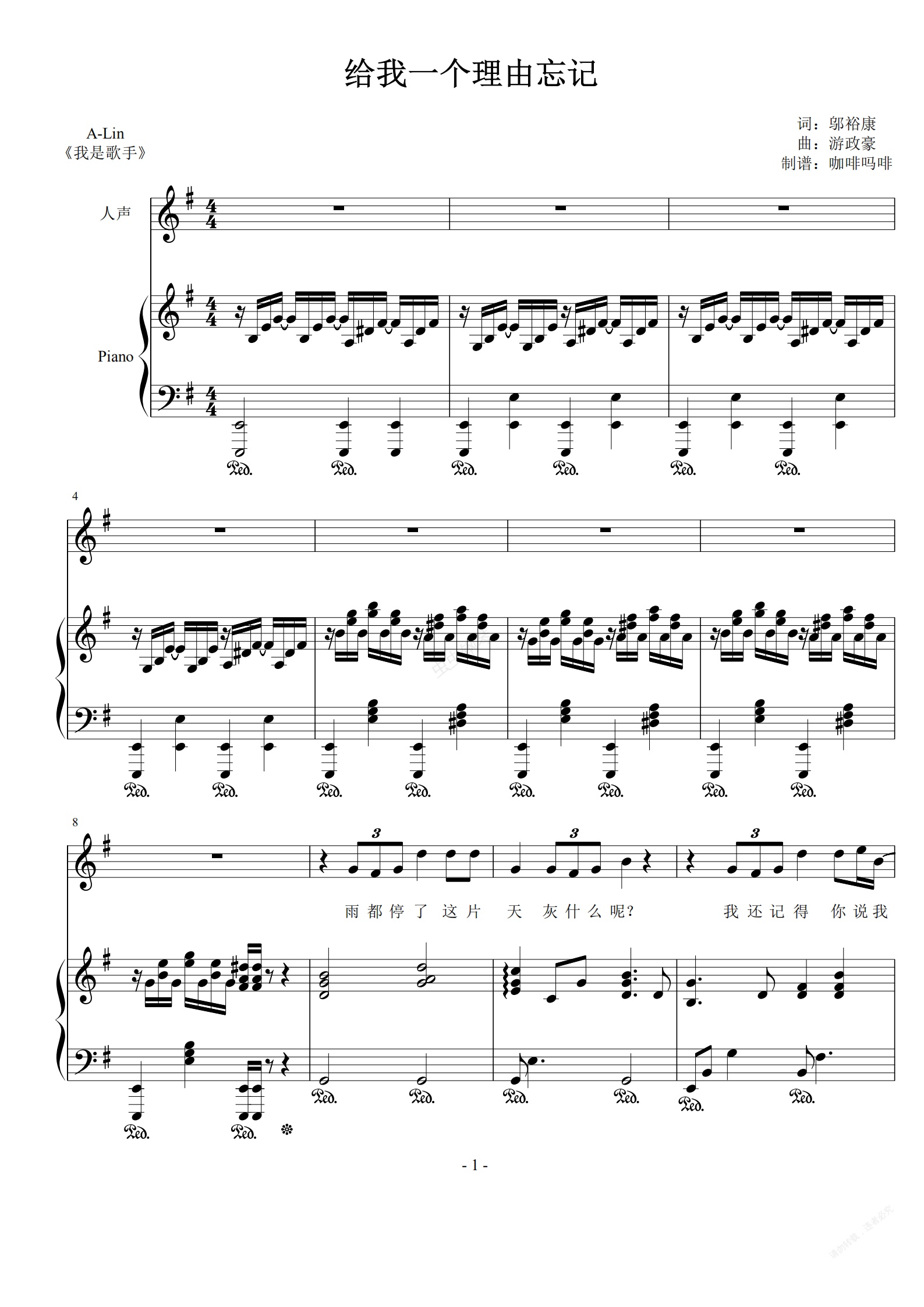 钢琴谱:给我一个理由忘记-ALin G调钢琴伴奏谱