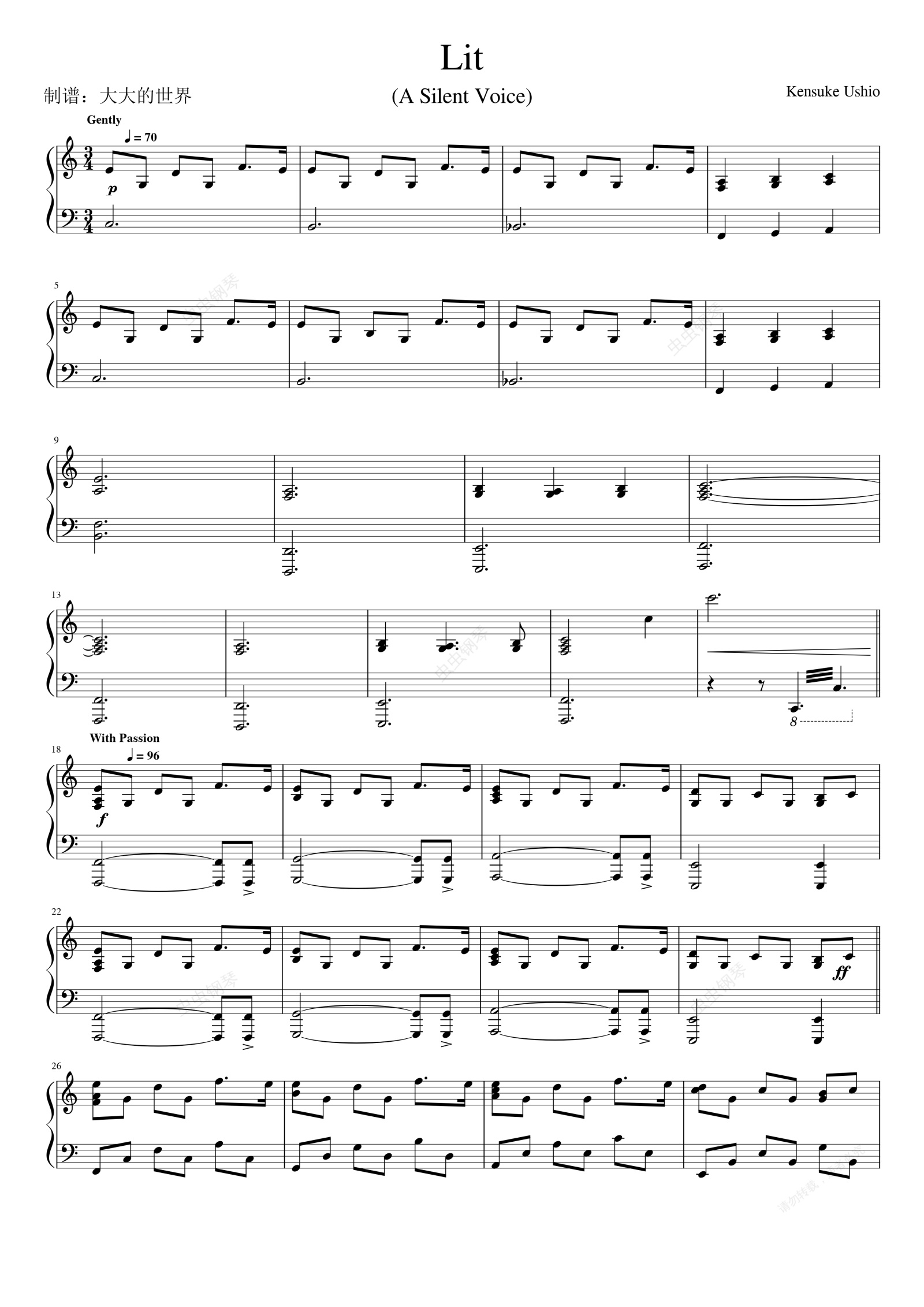 钢琴谱:Lit(A Silent Voice)【唯美简单C调】