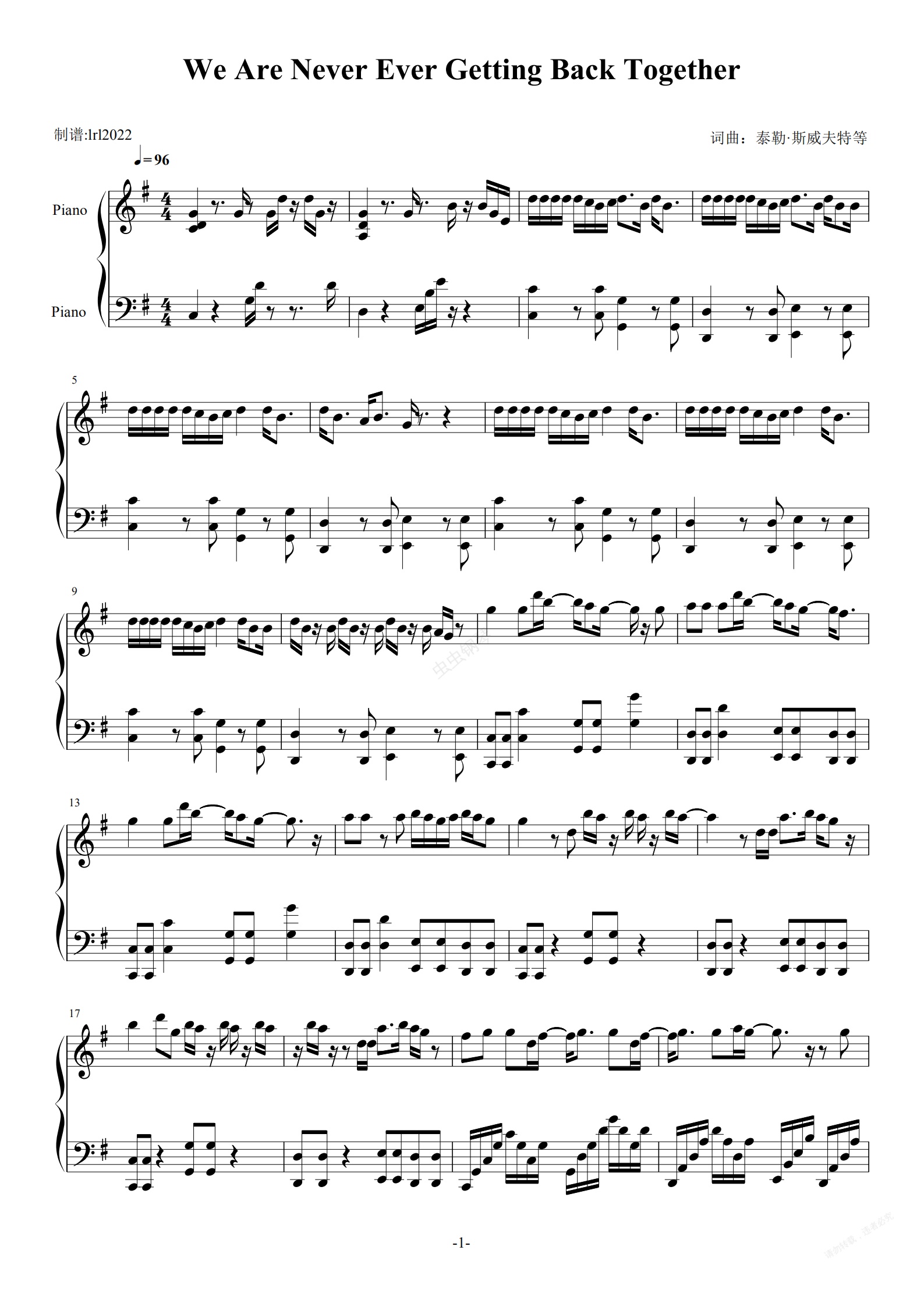 钢琴谱:We Are Never Ever Getting Back Together-钢琴谱-泰勒·斯威夫特-霉霉