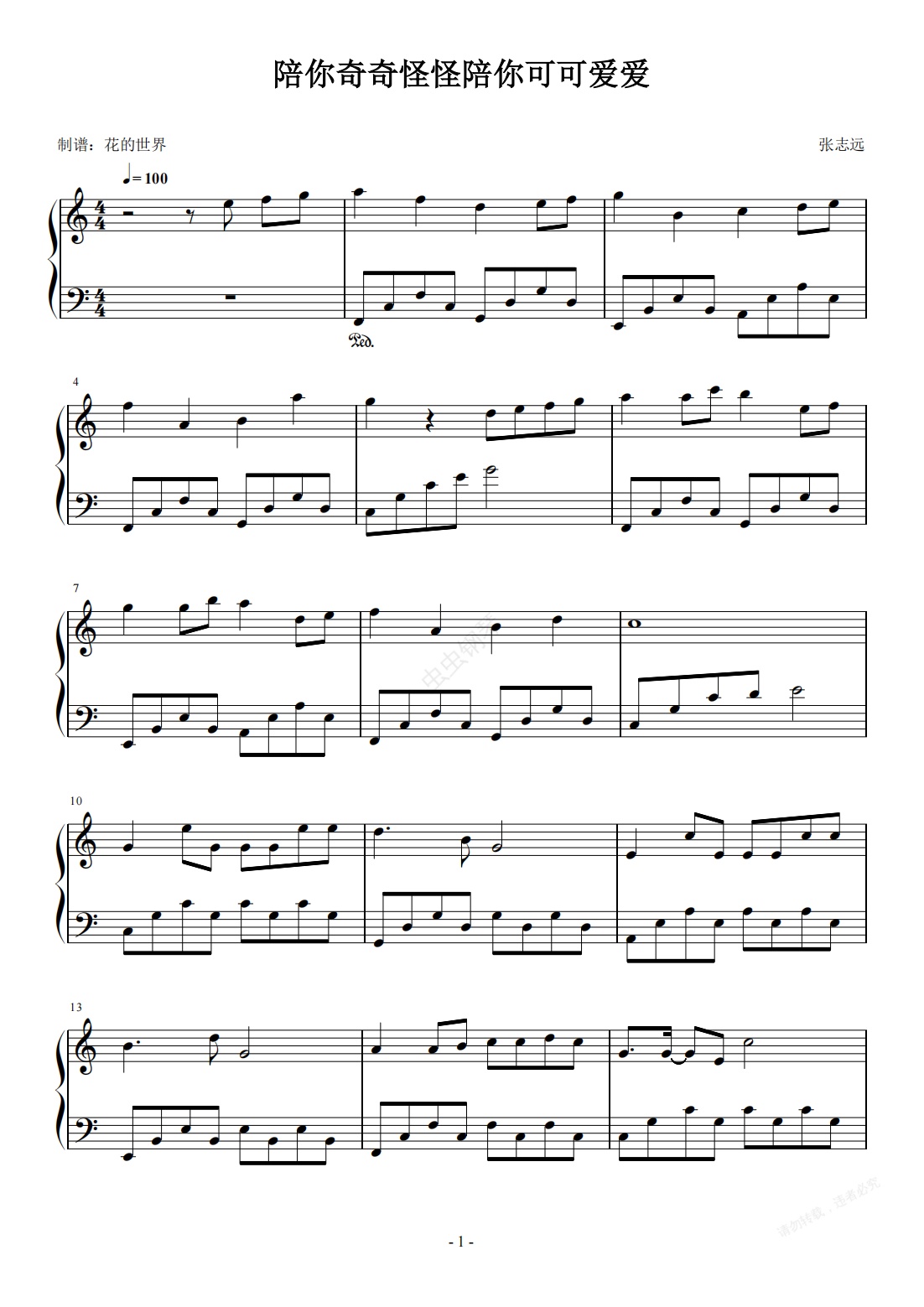 钢琴谱:陪你奇奇怪怪陪你可可爱爱 C调简易版  爱朵女孩